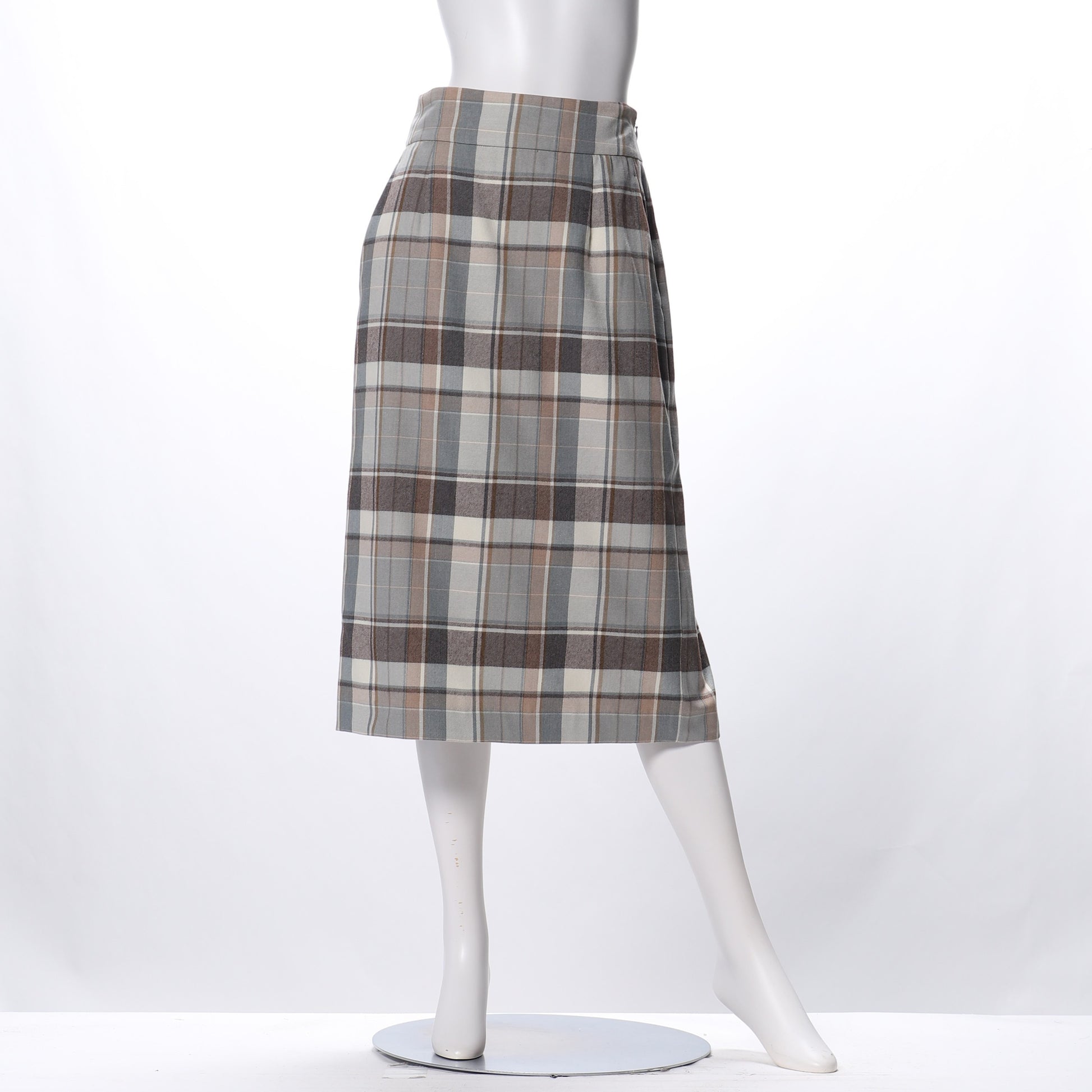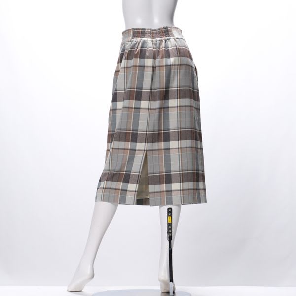 バックスリット入りのチェック柄セミタイトスカートです。スタンドカラーブラウスとポインテッドトゥパンプスを合わせて上品なスタイルや、ローゲージニットとフラットシューズを合わせてカジュアルなスタイルも素敵ですよ。