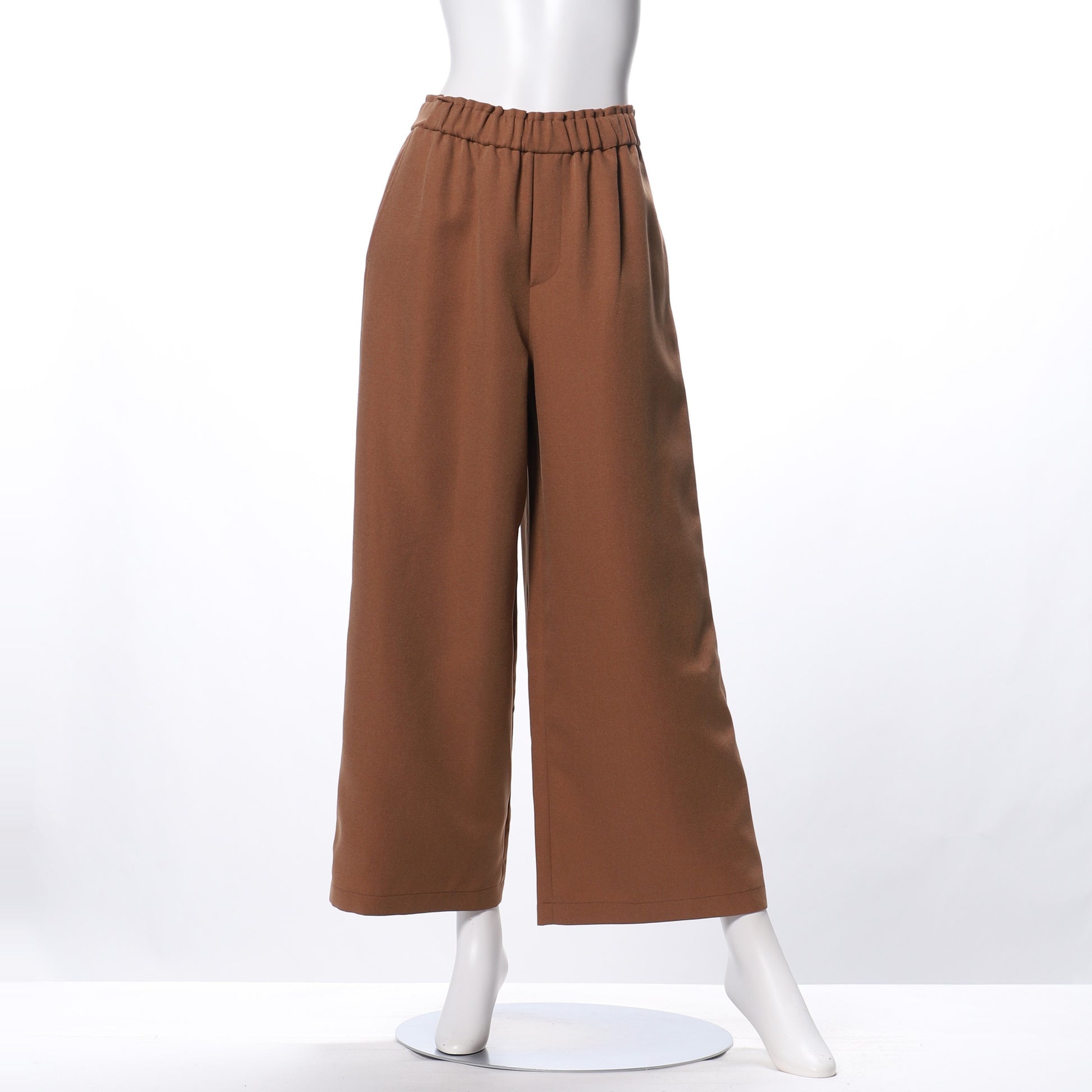 ウエスト総ゴムが楽チンなワイドパンツです。Vネックのハイゲージニットとパンプスを合わせてシャープなスタイルや、ゆったりとしたローゲージニットとスニーカーを合わせてカジュアルなスタイルもスタイルも素敵ですよ。
