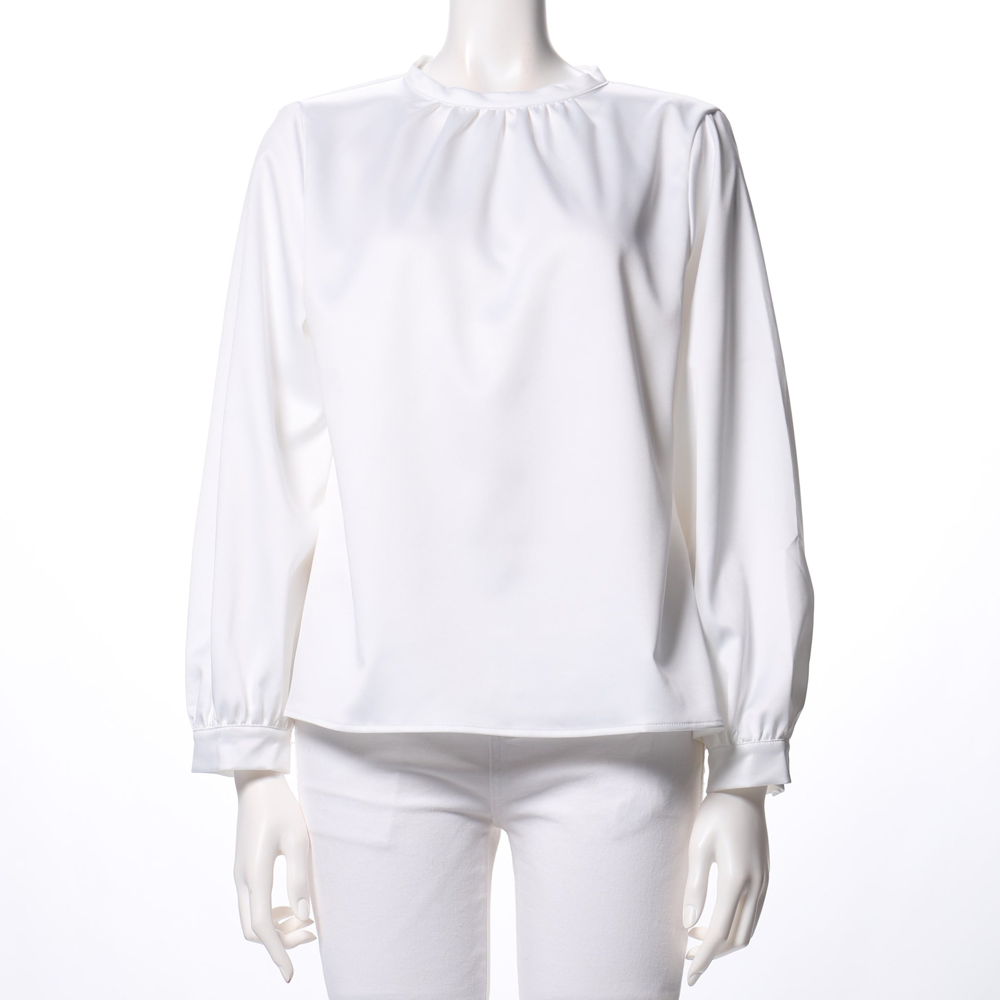 光沢のある素材感が華やかな、ギャザーネックのブラウス。タイトスカートやテーパードパンツを合わせてオフィスライクに、柄入りのフレアスカートなどを合わせた装いも素敵ですね。