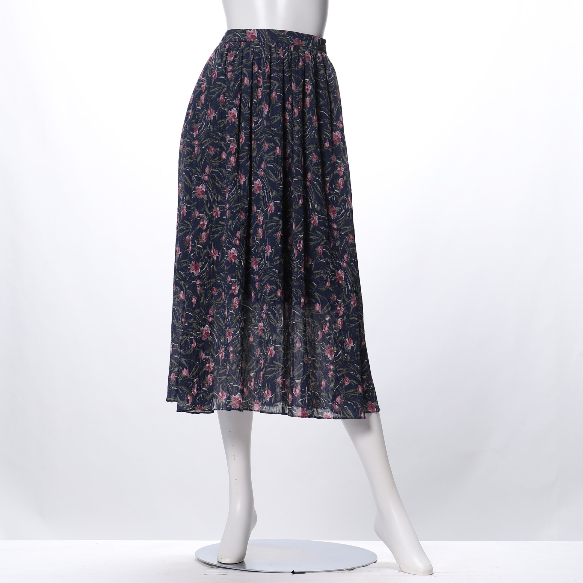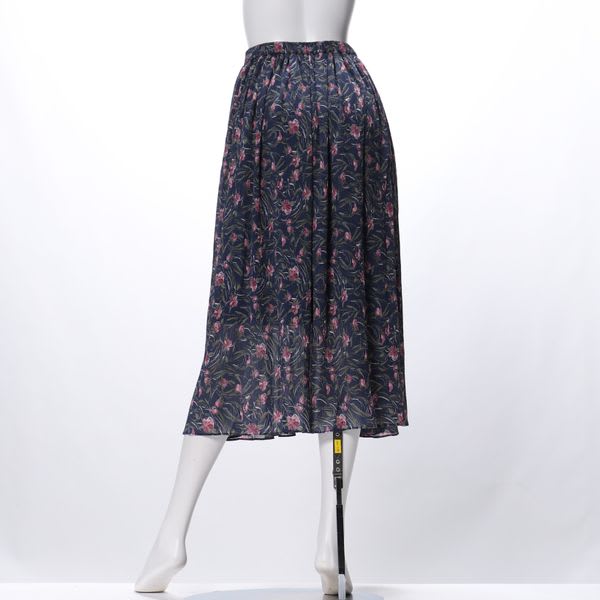 マジョリカプリーツ加工の中花柄スカート。とろみブラウスとポインテッドトゥパンプスを合わせてレディライクなスタイルや、ローゲージニットとスニーカーを合わせてカジュアルなスタイルも素敵ですよ。