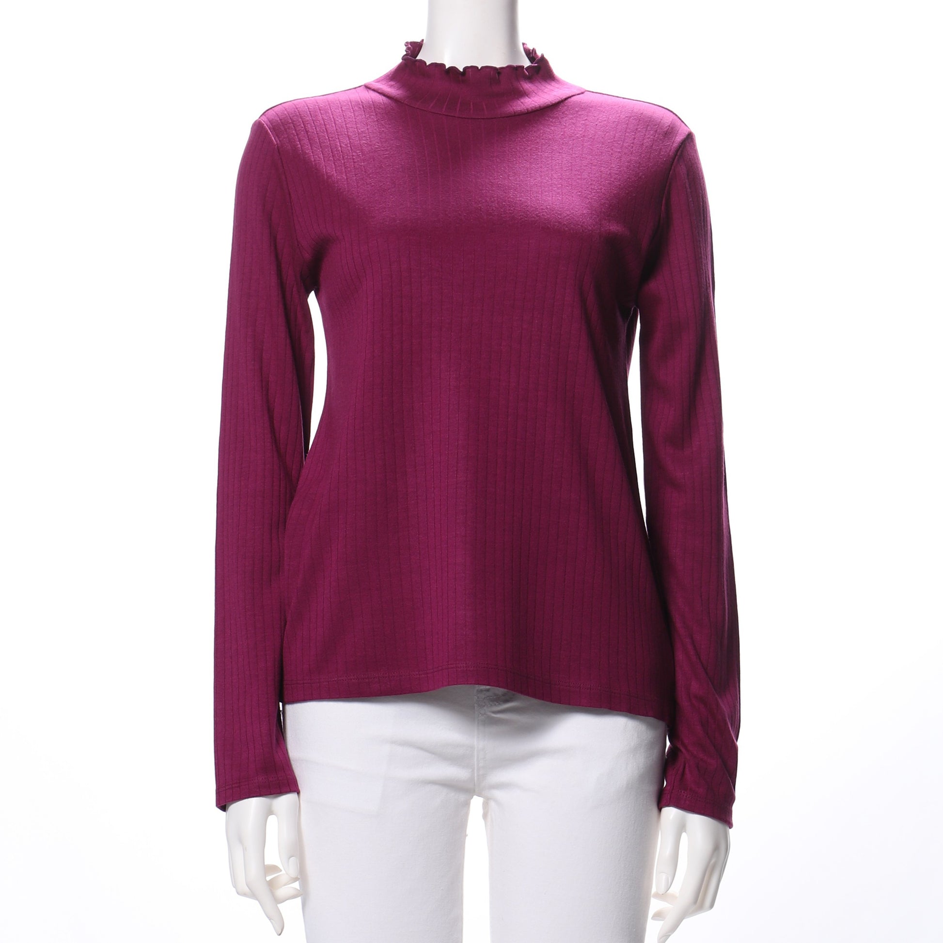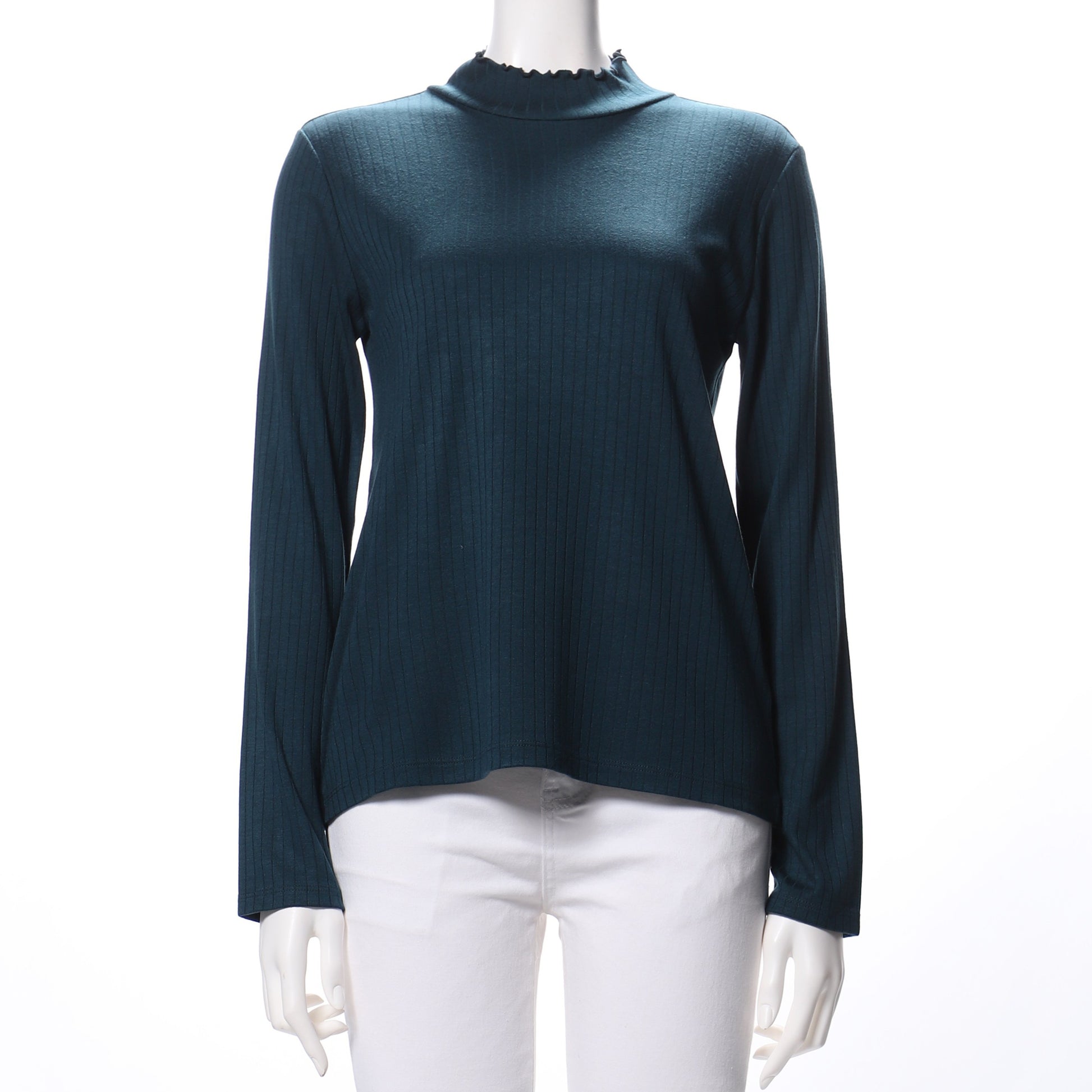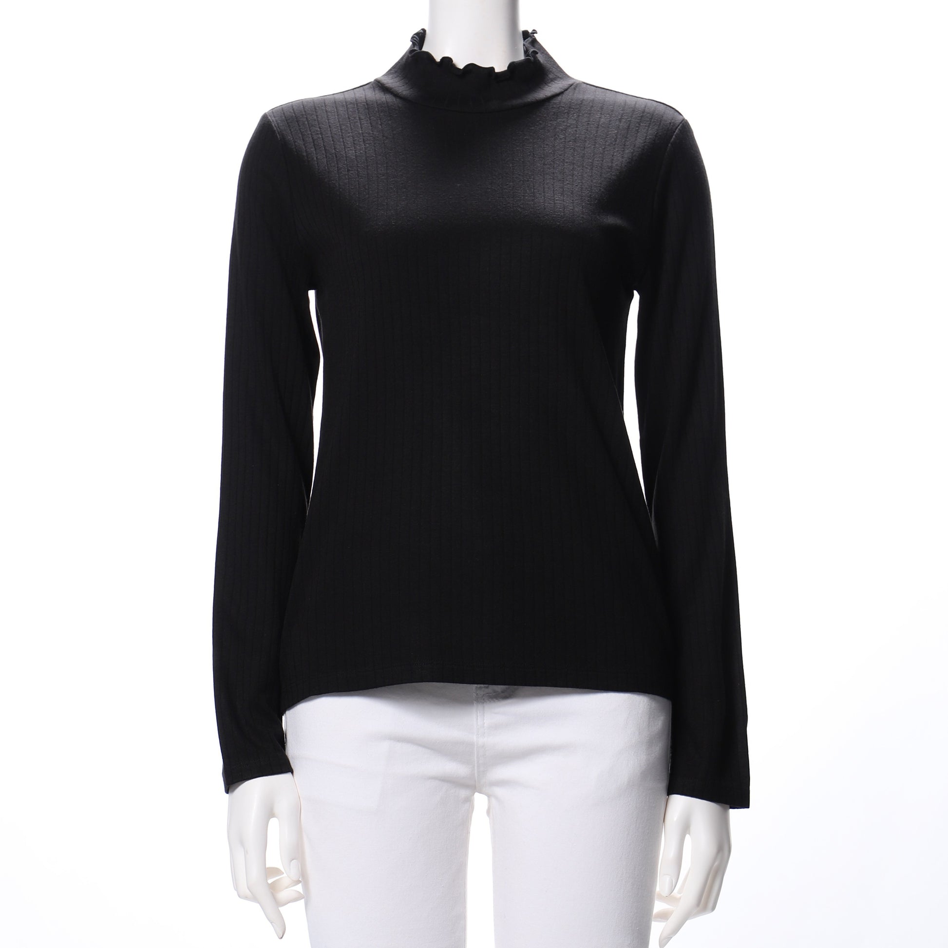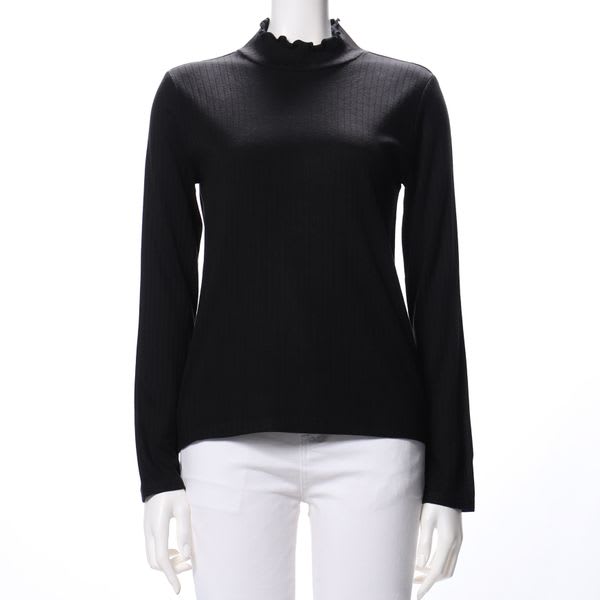 フリルネックがポイントのカットソーです。プリーツスカートと合わせてフェミニンスタイルに、テーパードパンツと合わせた甘辛ミックススタイルも良いですね。