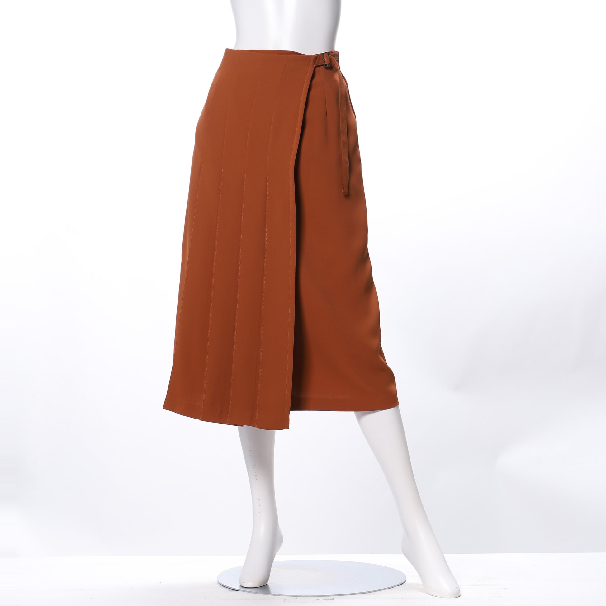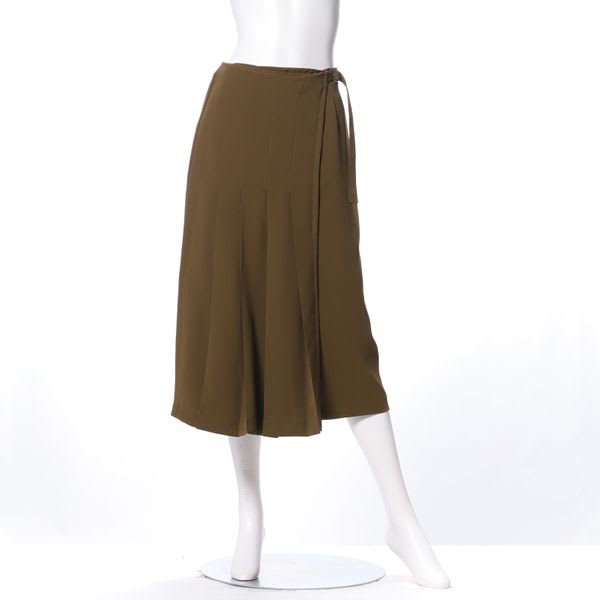ラップ風セミタイトスカートです。フロントのプリーツデザインが特徴的ですね!ボウタイブラウスに合わせてキチンと感のあるオフィススタイルに、ボートネックのリブカットソーに合わせてキレイめカジュアルコーデもいいですね!