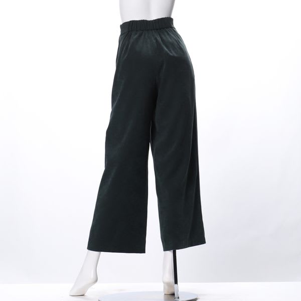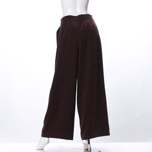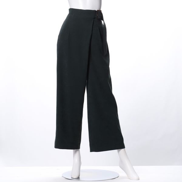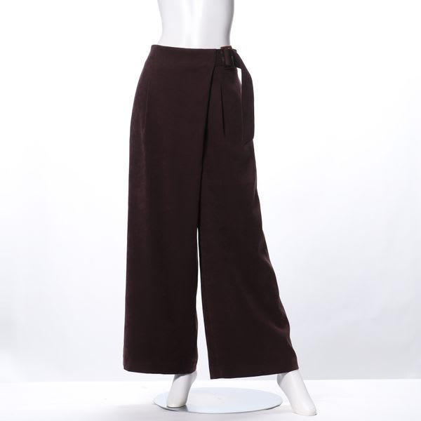 サンディングピーチ素材のウエストベルト付きラップ風ワイドパンツです。バンドカラーブラウスとヒールパンプスを合わせてスタイリッシュなスタイルや、ローゲージニットとスニーカーを合わせてカジュアルなスタイルも素敵ですよ。
