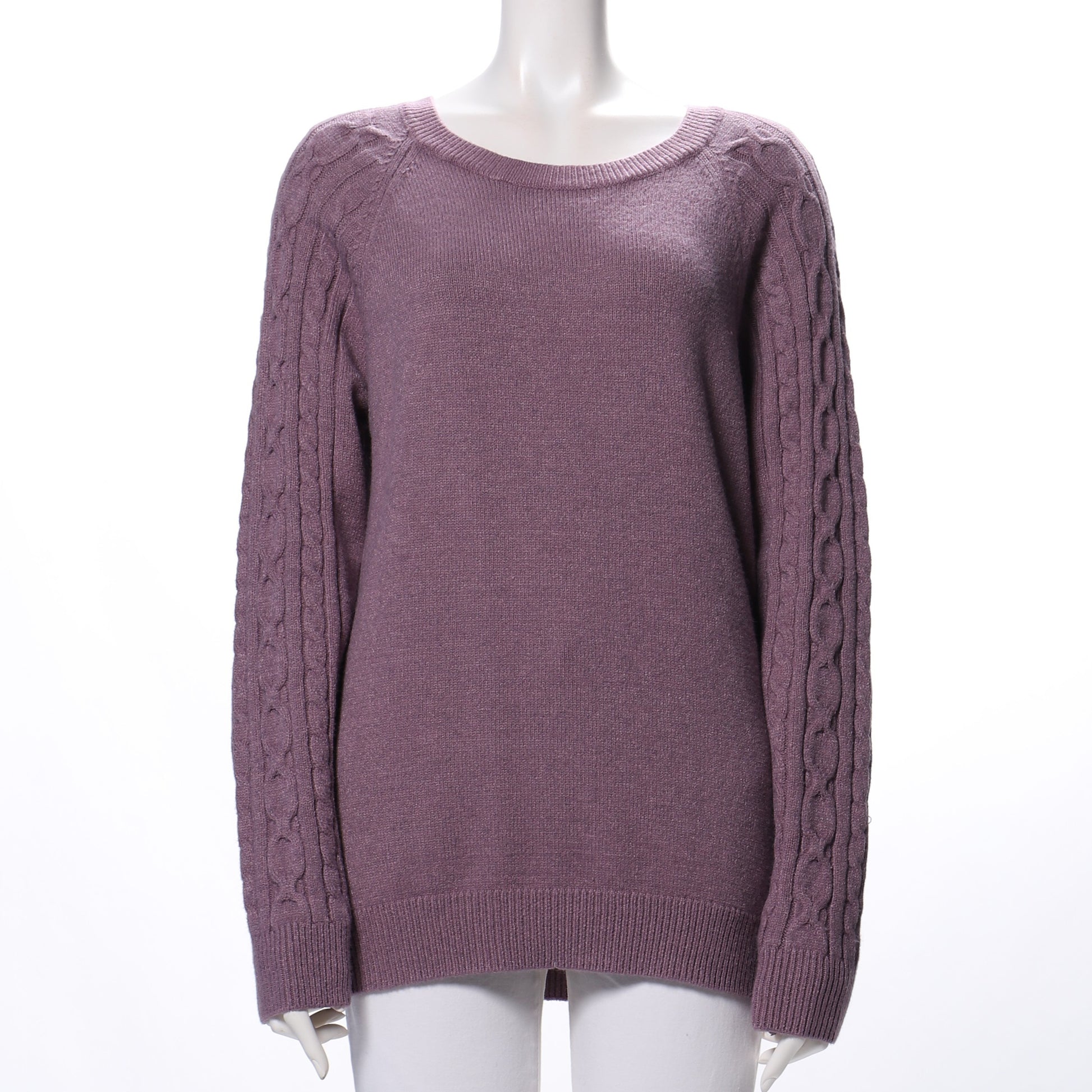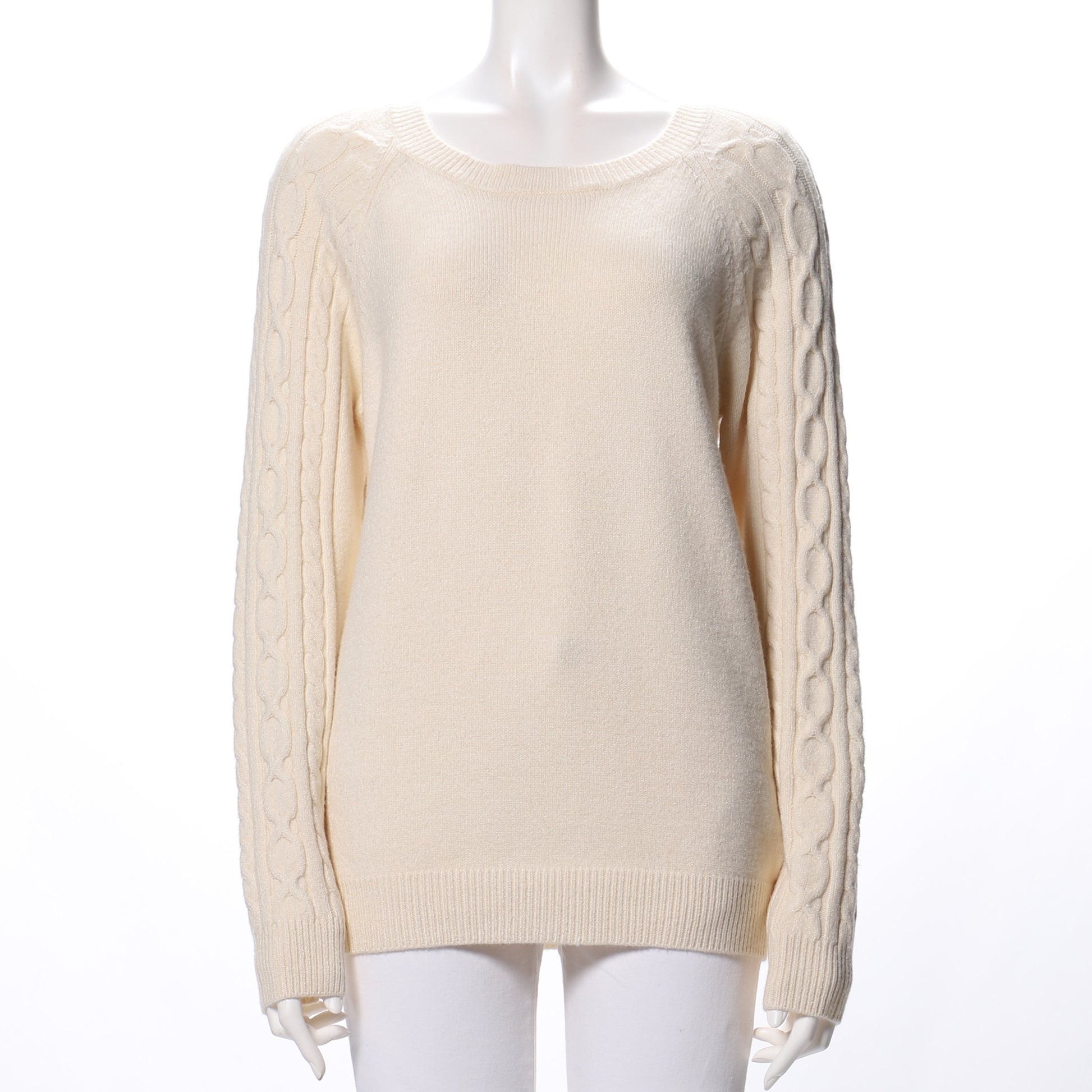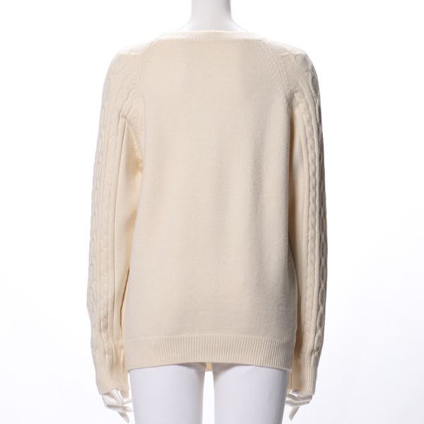 ざっくりとした袖のケーブル編みがアクセントになるニットです。落ち感のあるスカートと合わせて、女性らしいコーディネートに。デニムパンツと合わせて、カジュアルな仕上がりも素敵です。