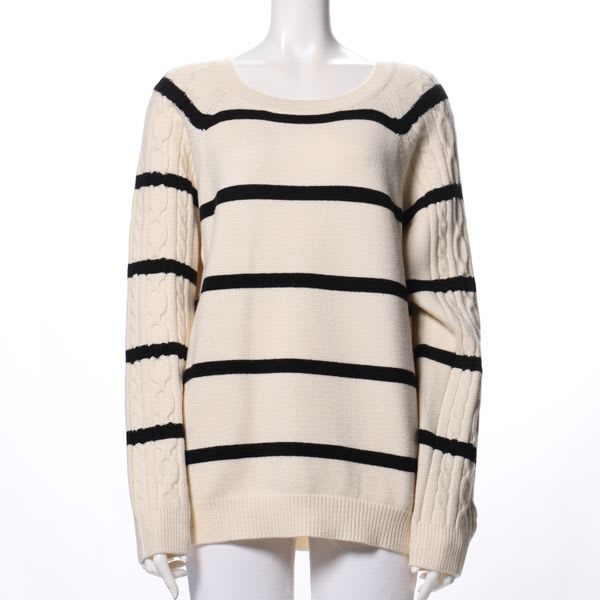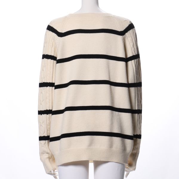 お袖がケーブル編みになったボーダー柄ニット。ボトムスにはデニムパンツを合わせてカジュアルに、タイトスカートで女性らしさをプラスしてもいいですね。