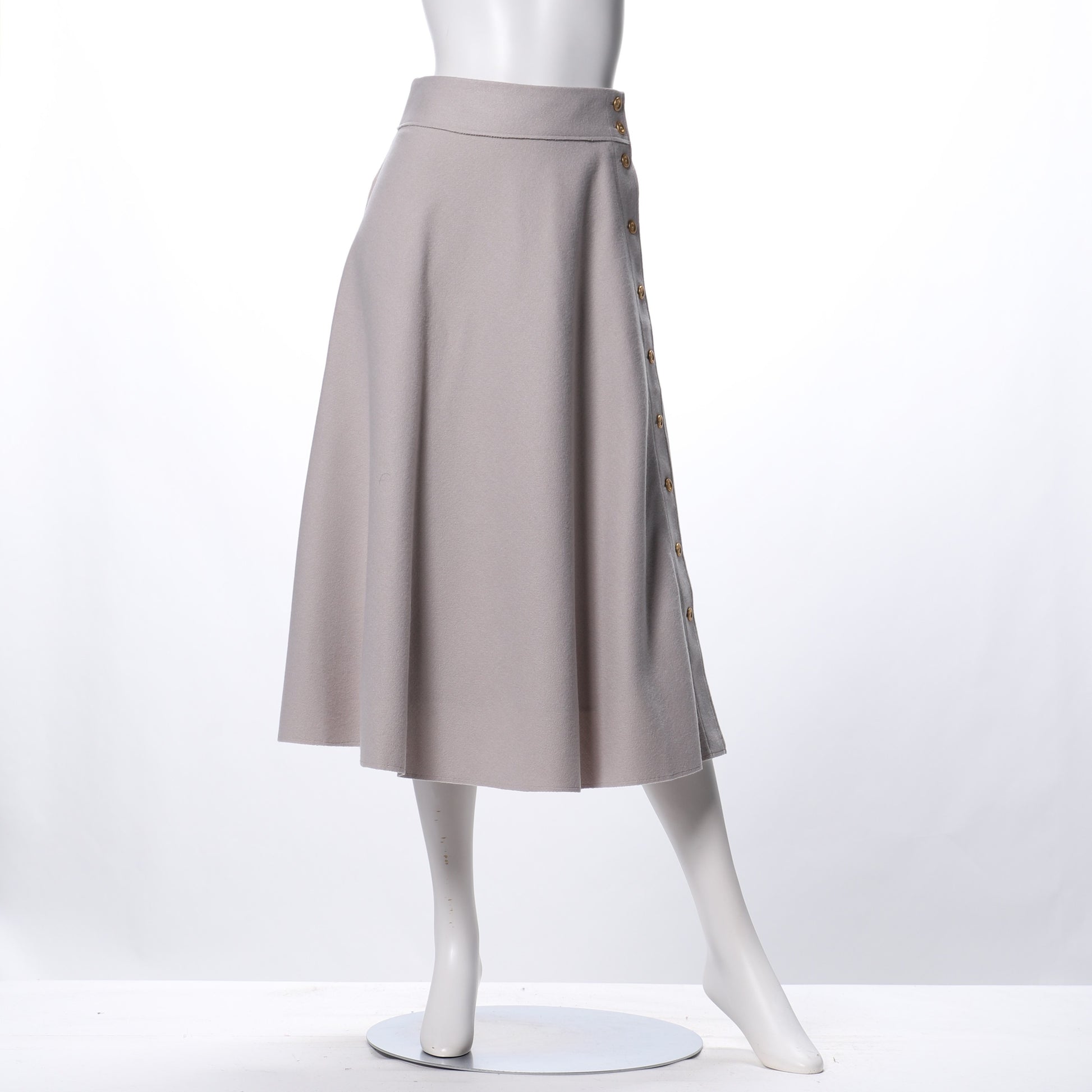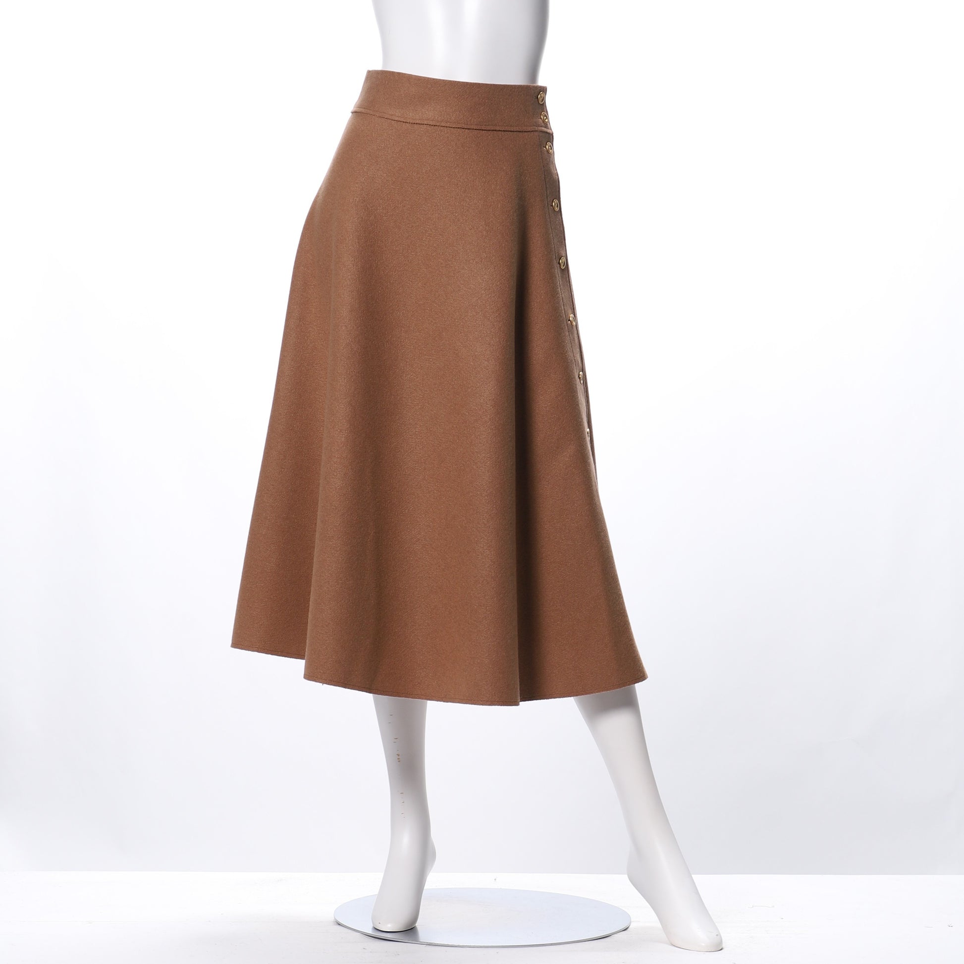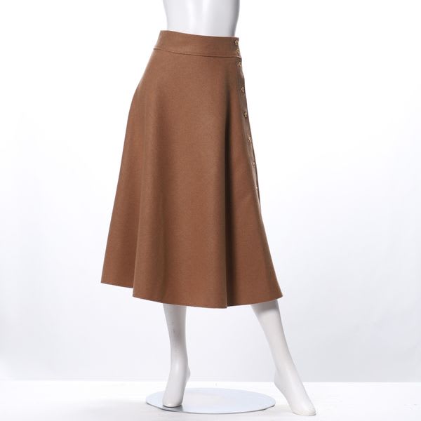 サイドのボタンデザインが特徴的なフレアスカート。ブラウスとパンプスできれいめな印象に。ローゲージニットとスニーカーでカジュアルな着こなしも良いですね。