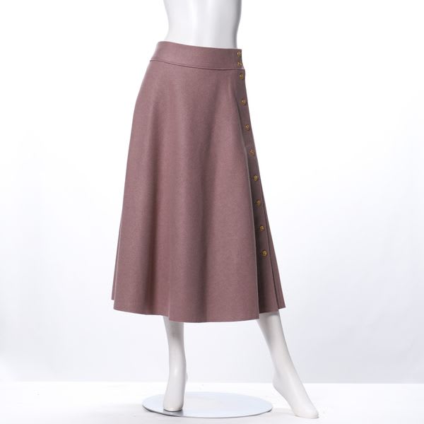 「自分では選ばないけれど着てみたい色とデザインのスカートでした。ウエスト周りがトップスをインしてもすっきりキレイなデザインでスタイル良く見えて嬉しいです。ボタンの色があまり好きではないが周りの評判は良かったです。腰周りや膝が冷えないし、サイズ丁度良く快適です。」