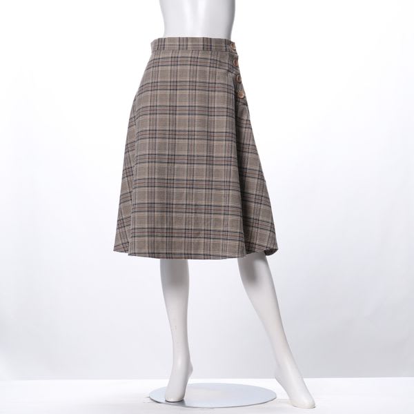 サイドのボタンがポイントのチェック柄フレアスカートです。コンパクトなハイゲージニットと合わせてキレイめカジュアルスタイルに、ボウタイブラウスと合わせたレディライクなスタイルも良いですね。