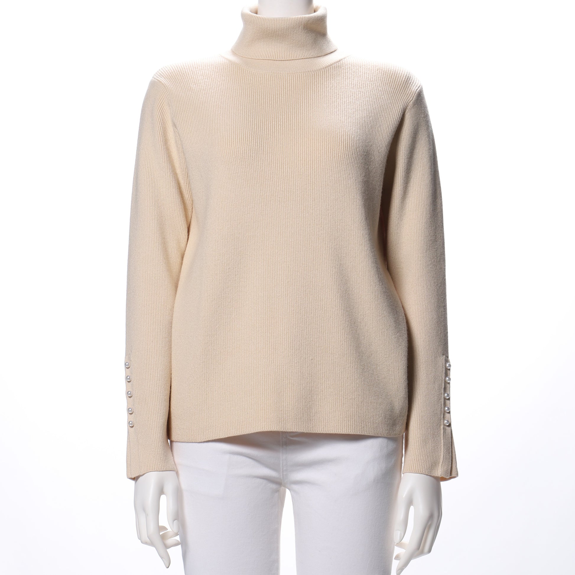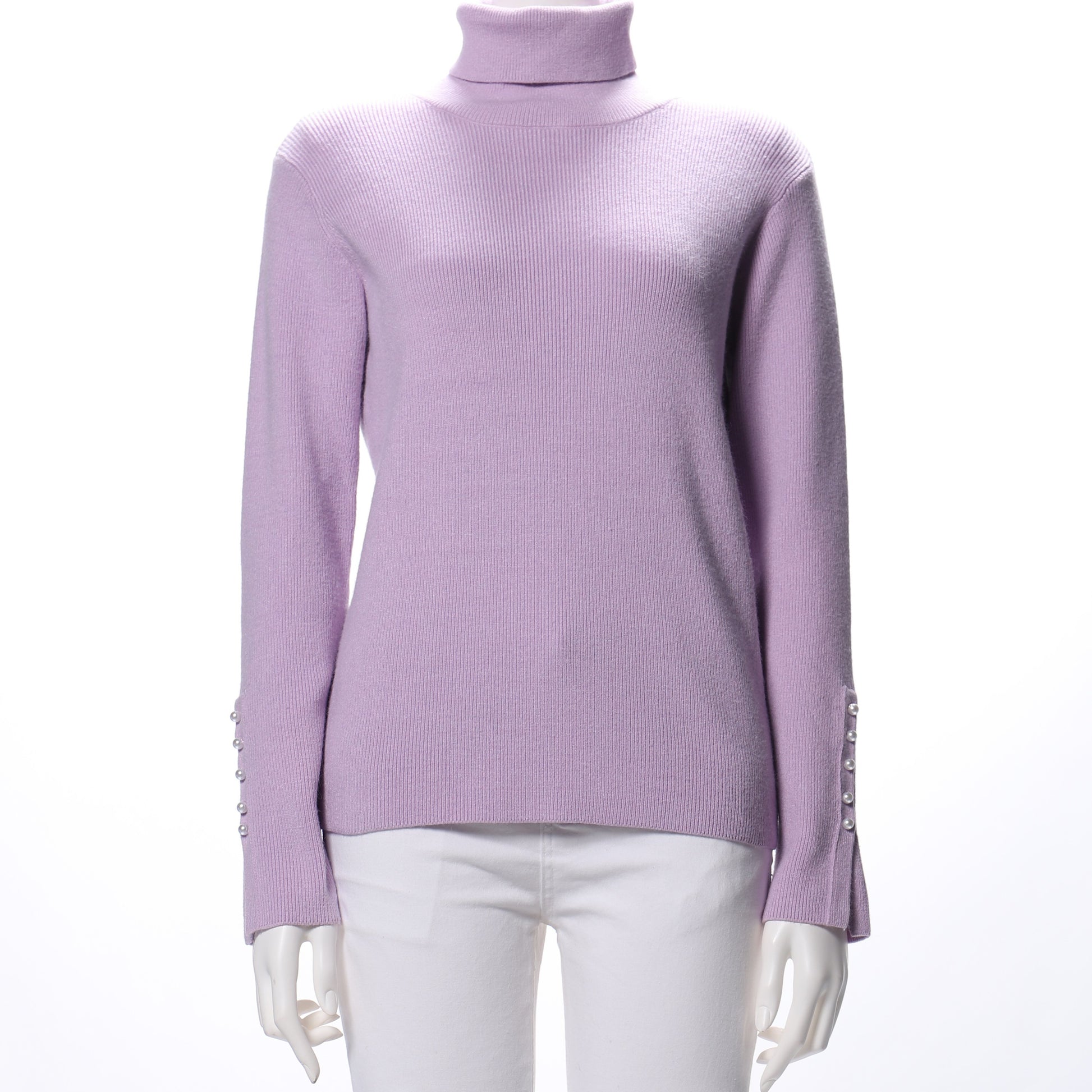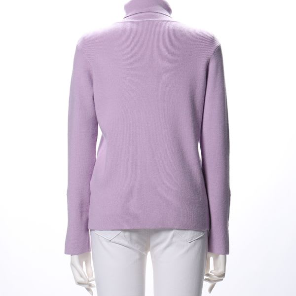 お袖のパールボタンがポイントのタートルネックニット。ボトムスにはワイドパンツを合わせてカジュアルに、フレアスカートで大人可愛くまとめてもいいですね。