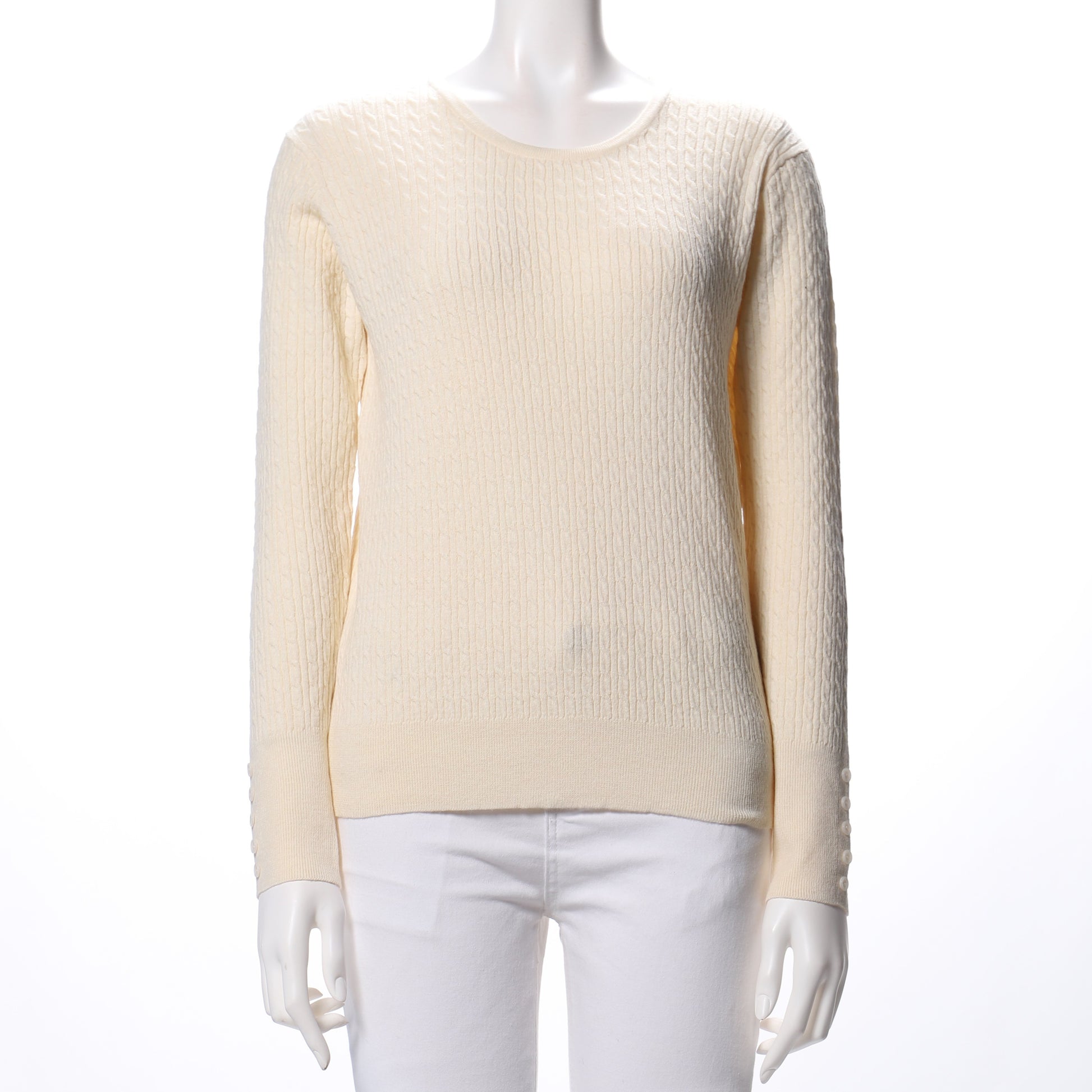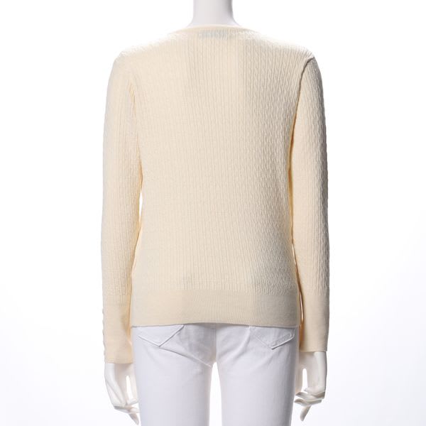 デザイン編みのラウンドネックニット。袖口の飾りボタンがポイントになりますね。テーパードパンツにローファーを合わせたトラッドコーデや、フレアスカートにバレエシューズを合わせたレディライクコーデも良いですね!