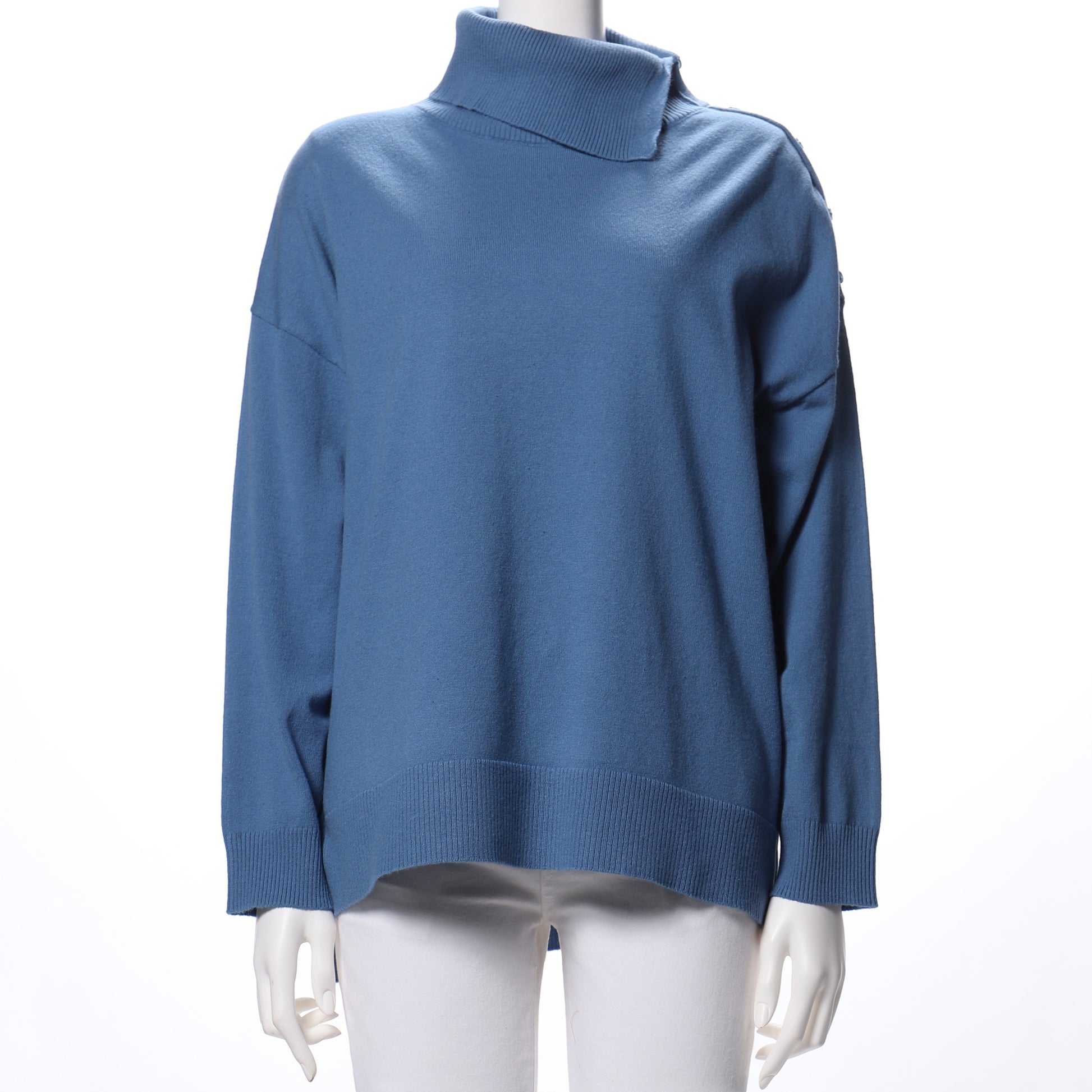 肩のボタンデザインがポイントのドロップショルダーニットです。タイトスカートと合わせてレディライクに、ワイドパンツと合わせたキレイめカジュアルスタイルもオススメですよ。