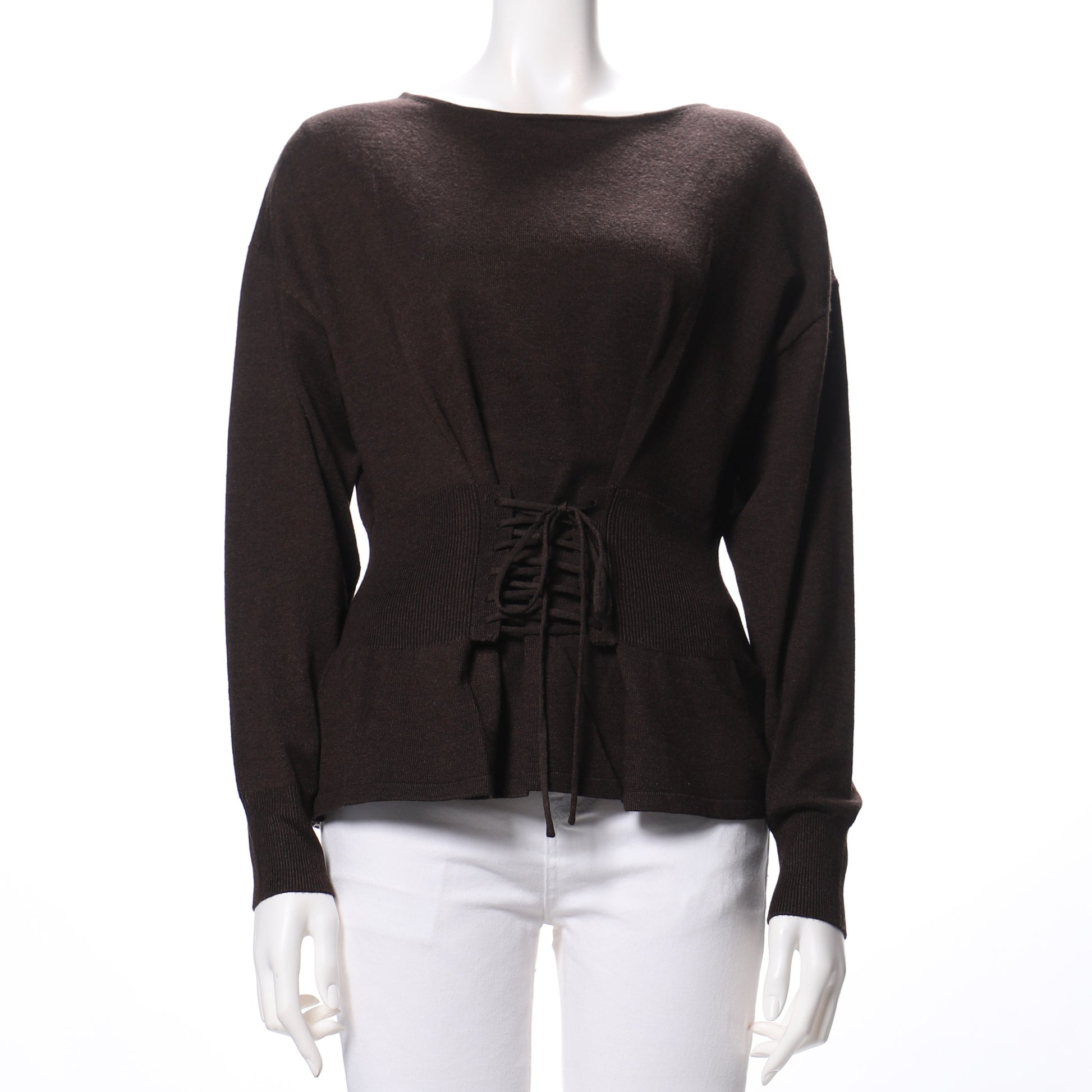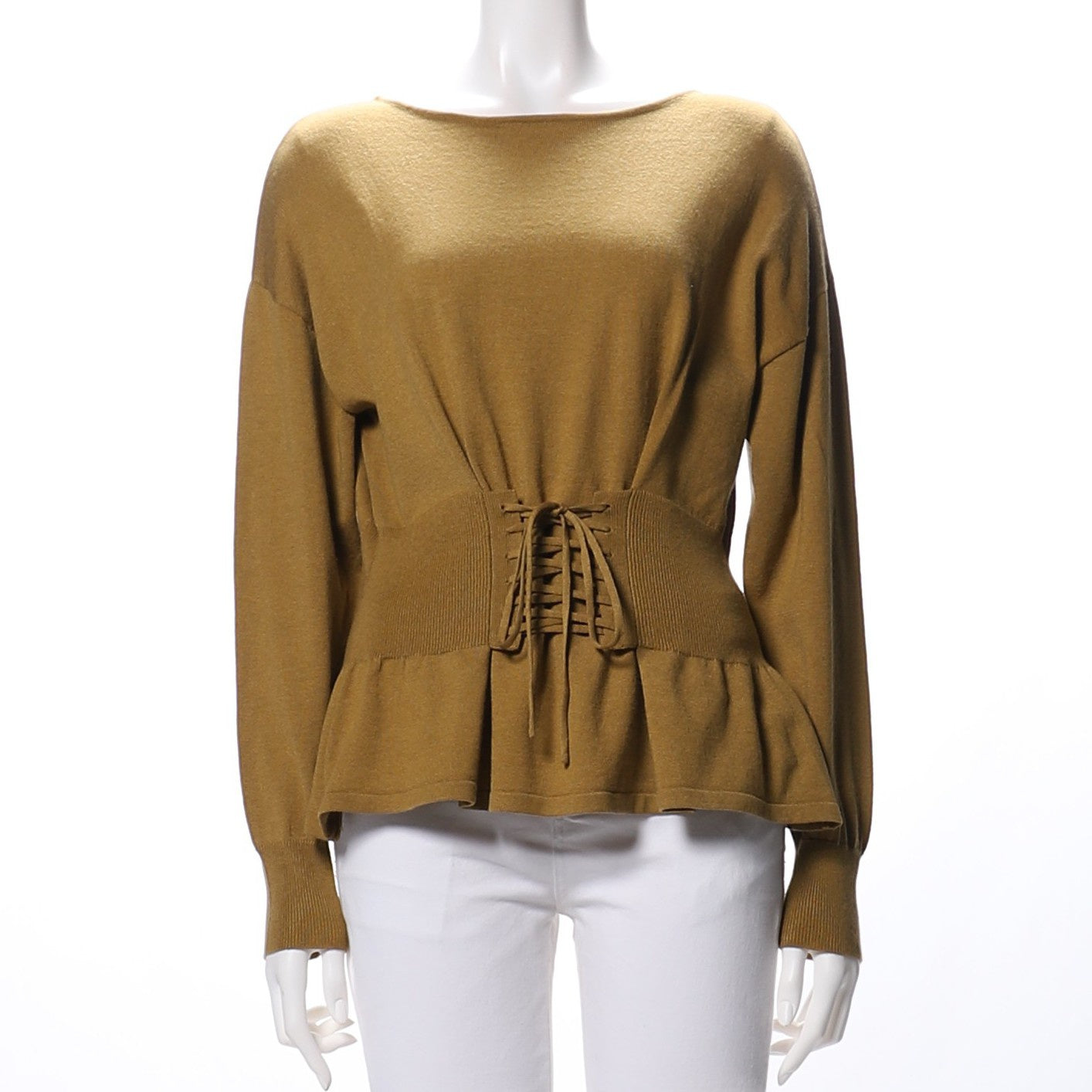 ウエストのレースアップデザインがポイントのニット。ボトムスにはデニムパンツを合わせてカジュアルに、タイトスカートで女性らしく仕上げてもステキです。