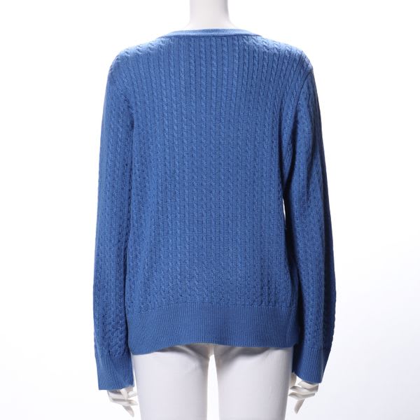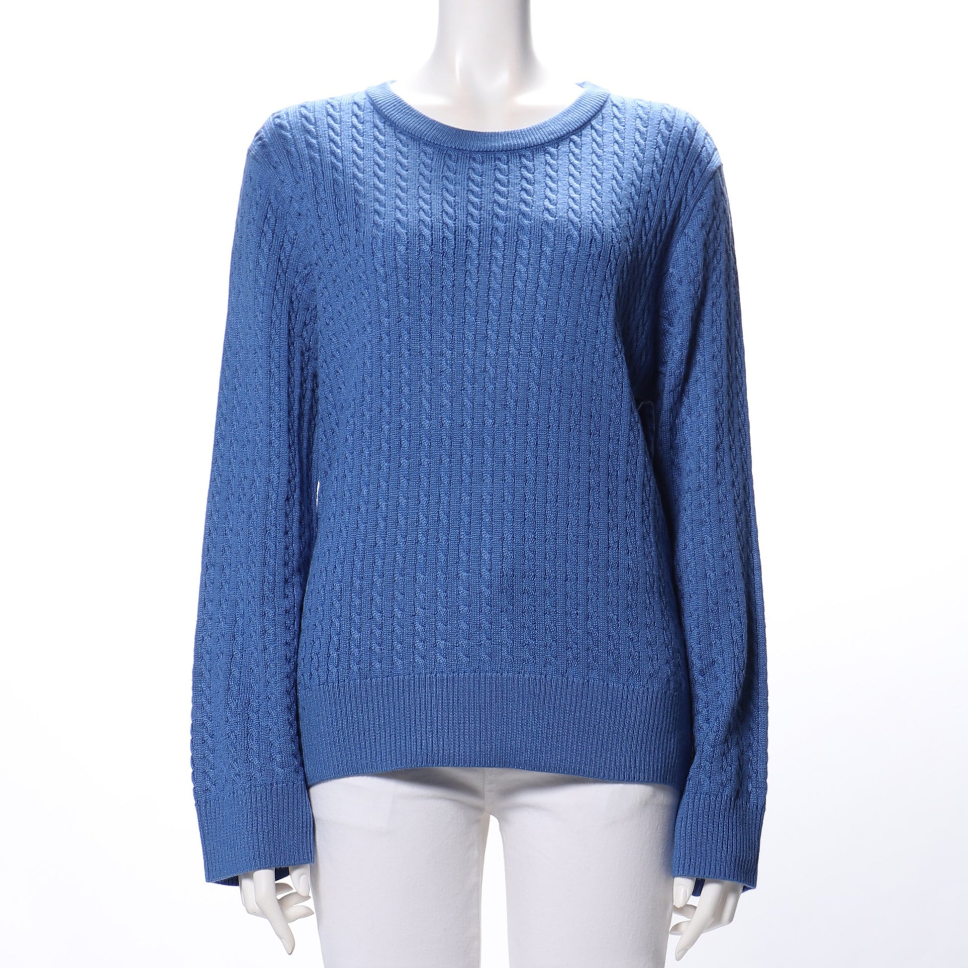 細ケーブル編みのラウンドネックニットです。テーパードパンツに合わせてマニッシュな感じに、長めのフレアスカートを合わせて上品な感じも素敵ですよ。