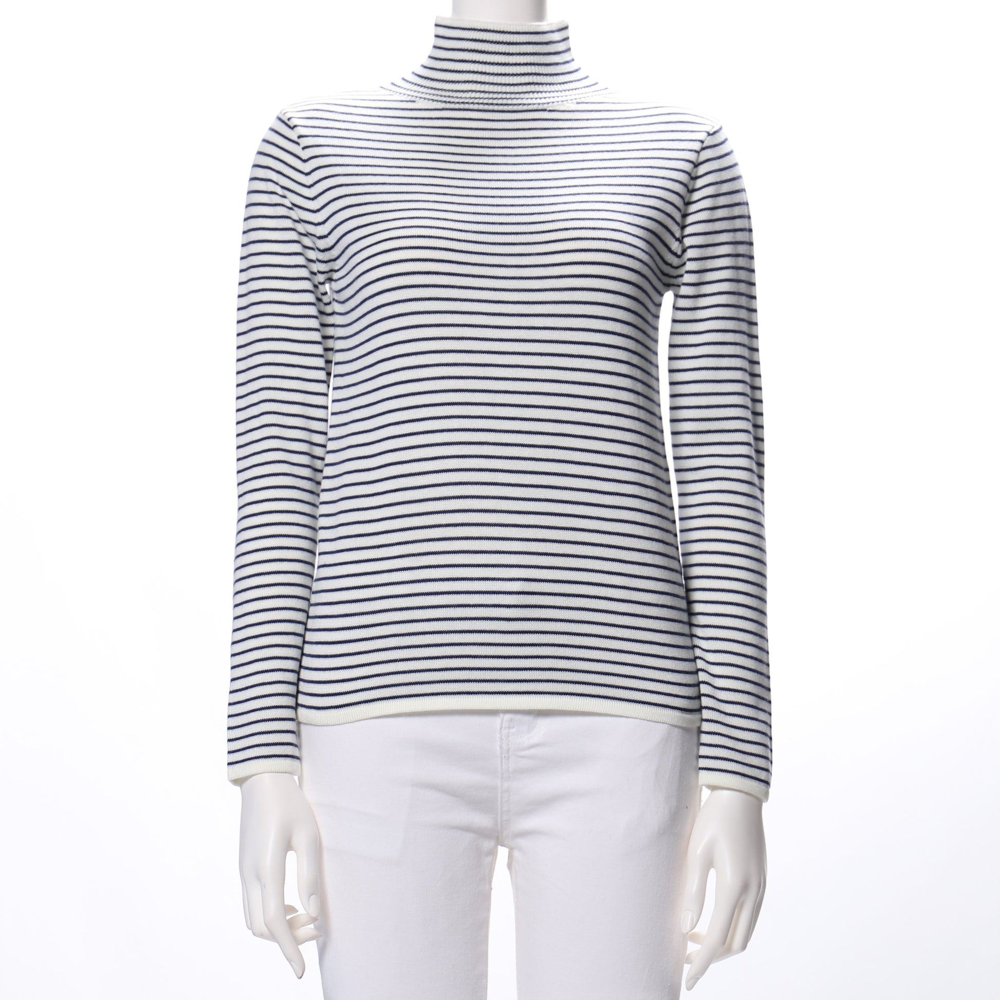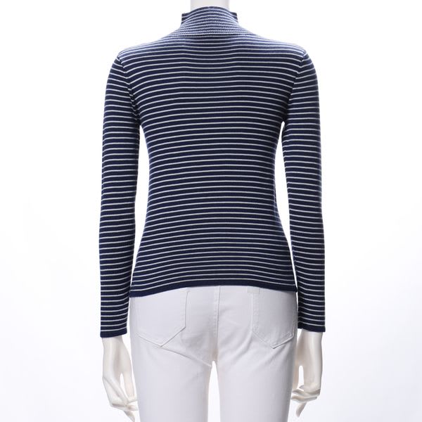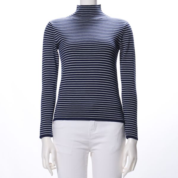 ハイネックのボーダー柄ニット。ボトムスにはAラインスカートを合わせて女性らしく、ワイドパンツでリラックス感のある着こなしもステキです。