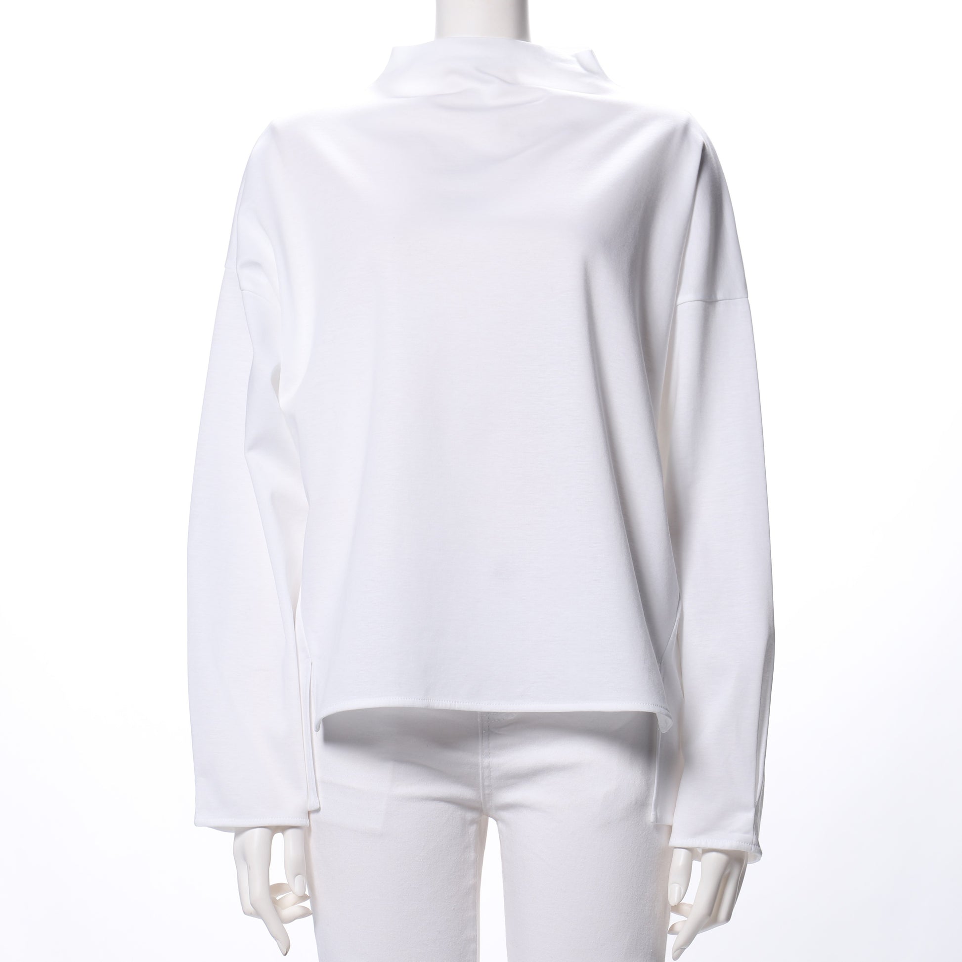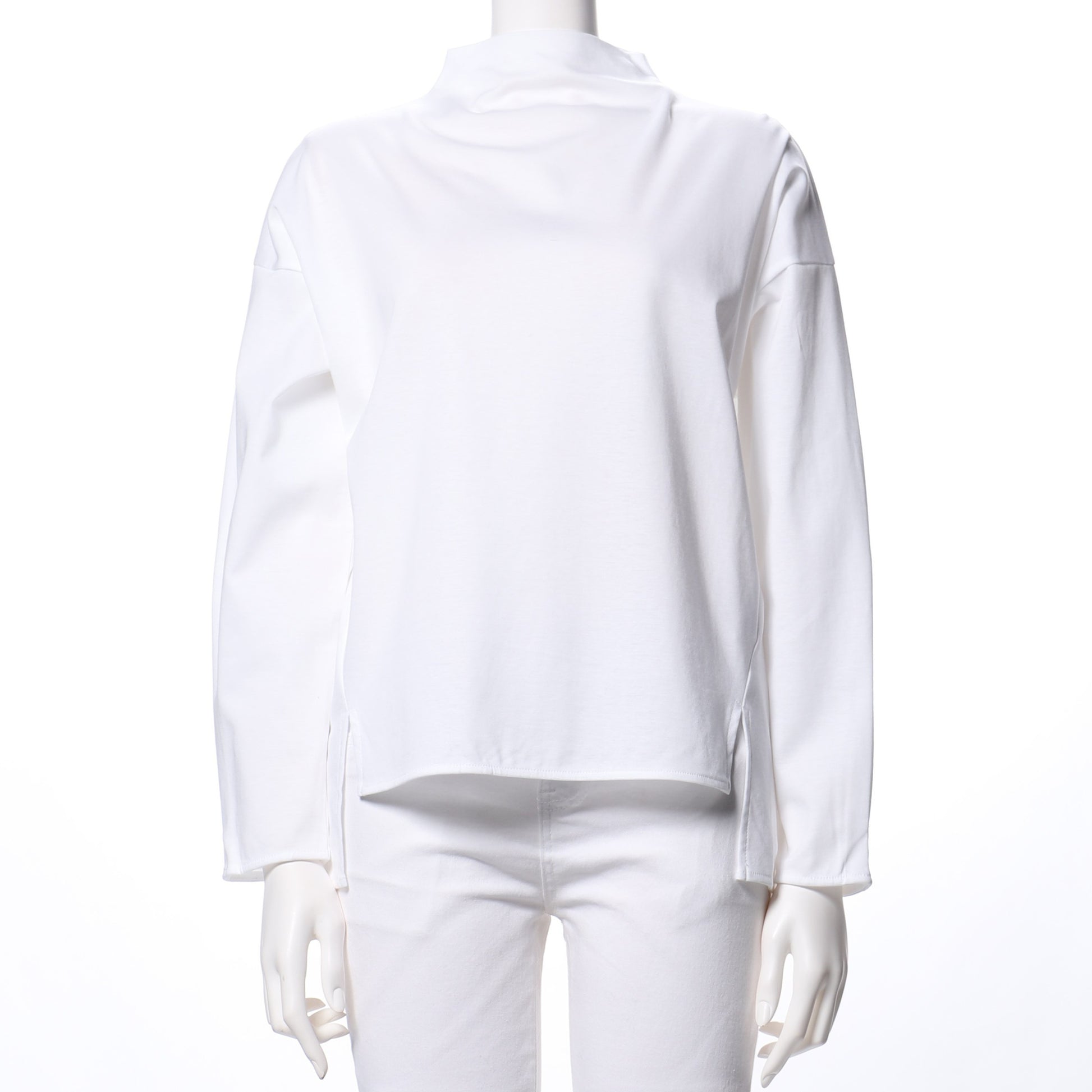 ハリ感のあるオフネックカットソーです。ボトムスにはデニムパンツを合わせてカジュアルに、プリーツスカートで女性らしくまとめてもいいですね。