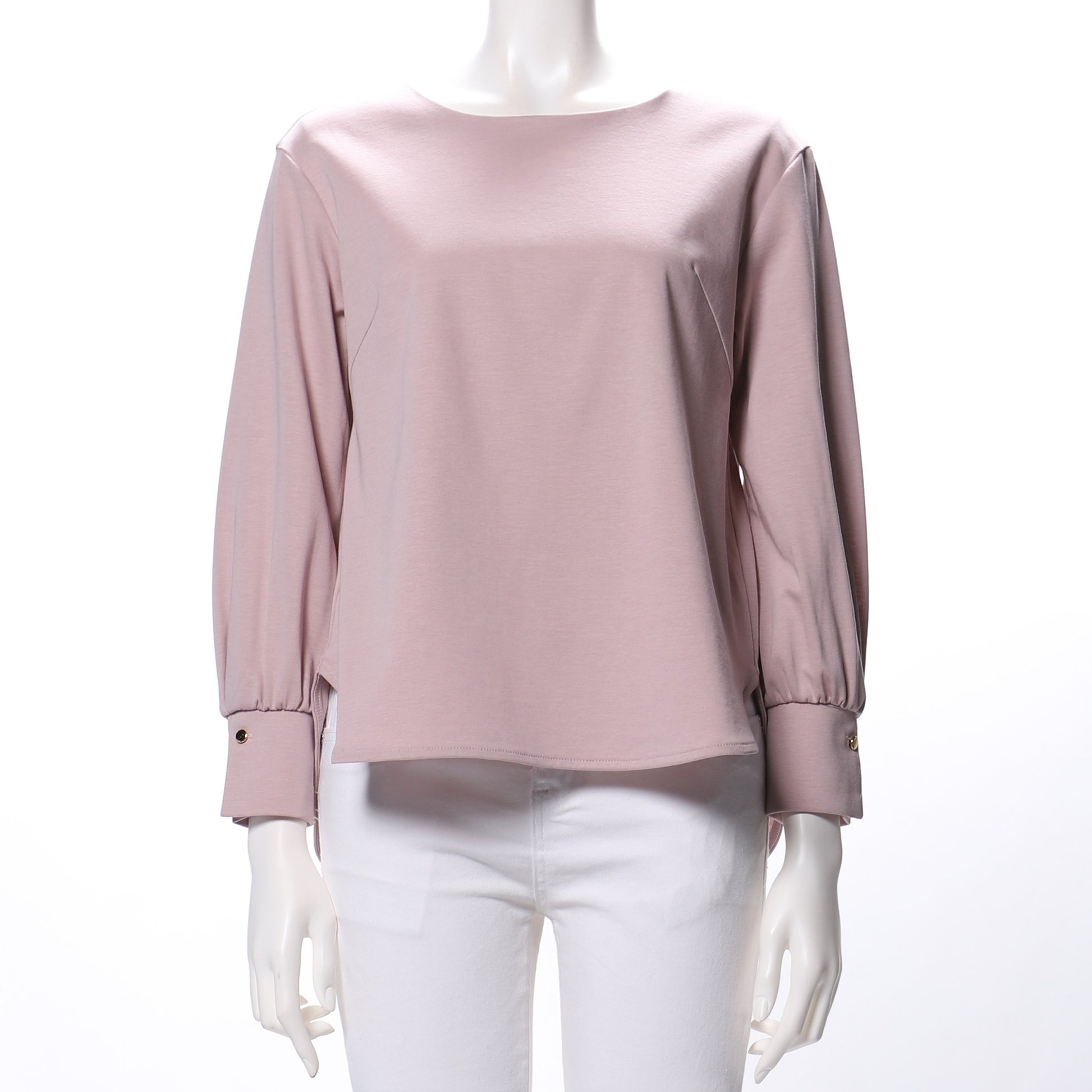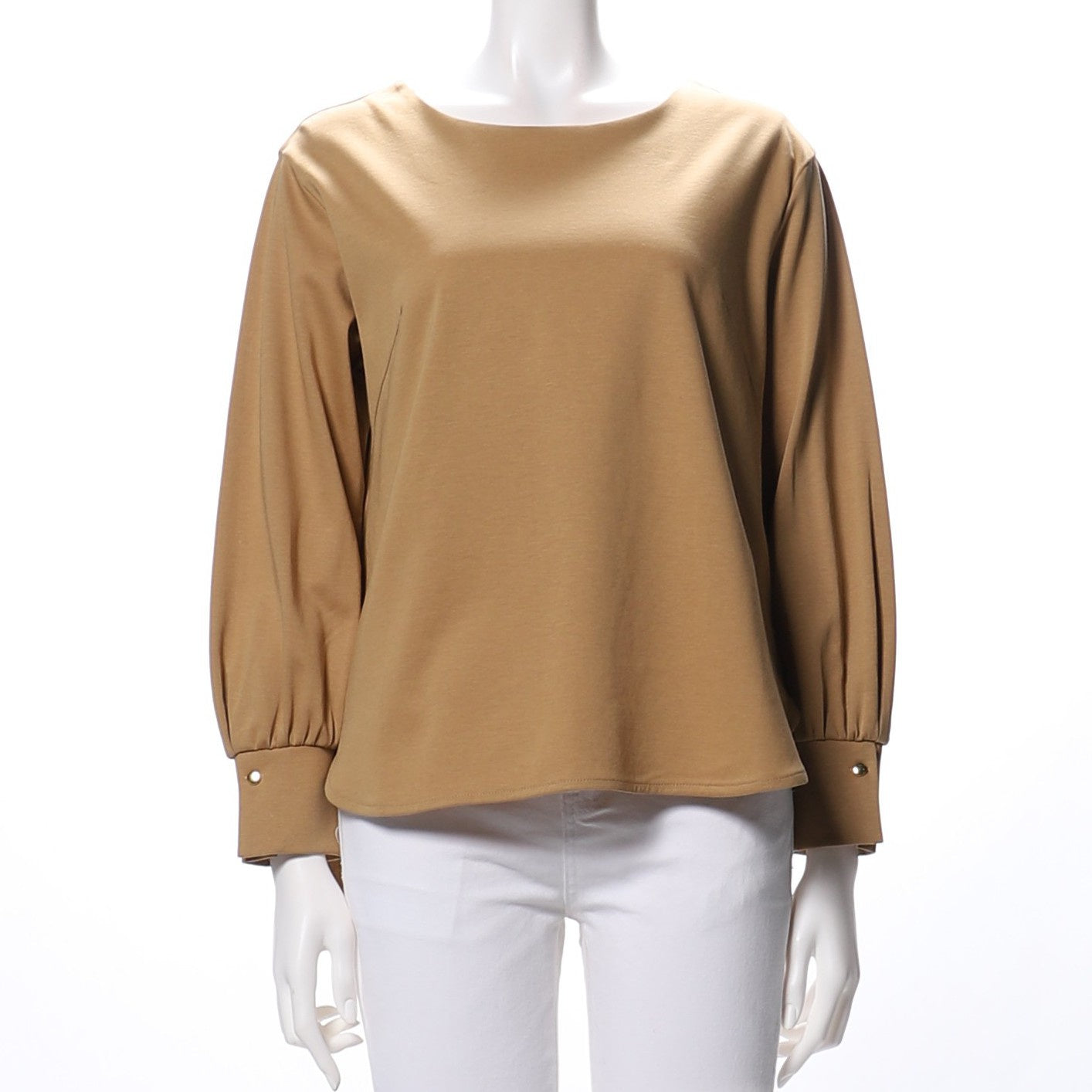 カフスがアクセントのラウンドネックカットソー。ボトムスにはデニムパンツを合わせてカジュアルに、フレアスカートでフェミニンにまとめてもいいですね。