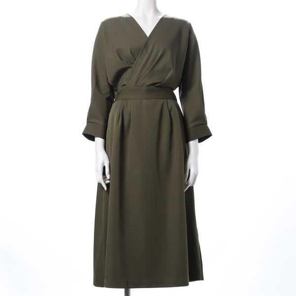 カシュクールデザインのワンピース。小物には華奢なワンポイントネックレスとラウンドトゥパンプスを合わせて上品に、バーモチーフのイヤリングとレザーブーティで辛めに仕上げてもいいですね。
