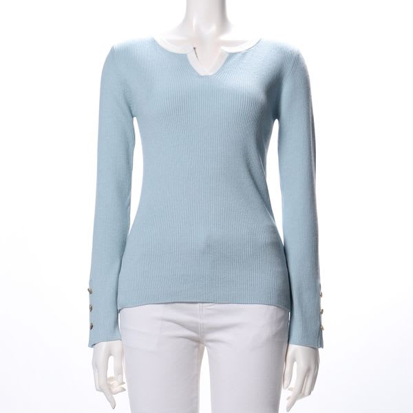 袖にボタンがあしらわれたオープンフロントネックニットです。フレアスカートにパンプスでフェミニンな仕上がりに。デニムパンツにフラットシューズでカジュアルにまとめても良いですね。