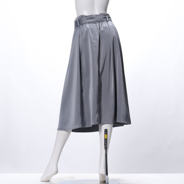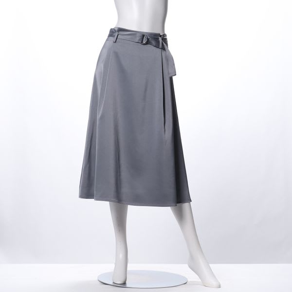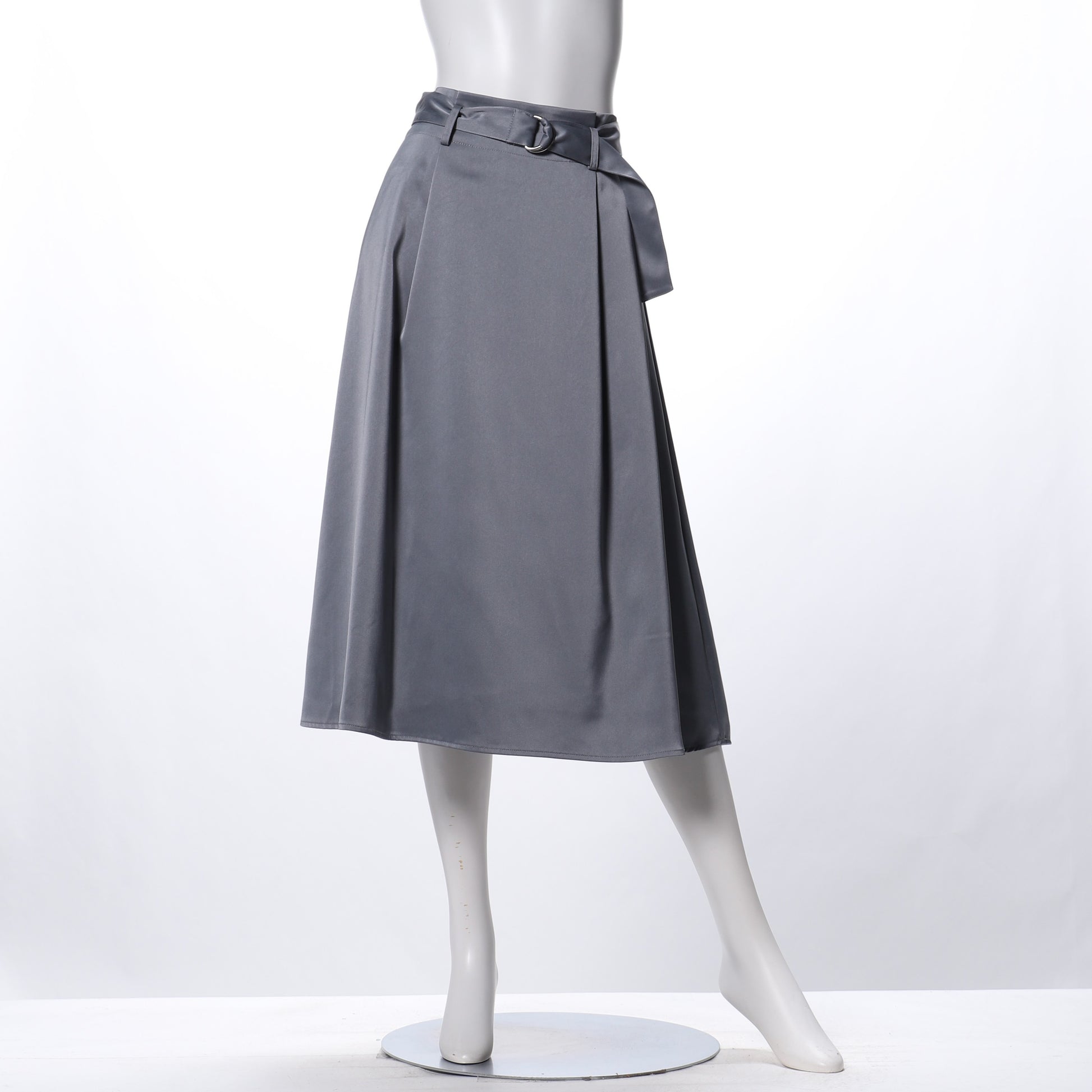 パウダーピーチサテン素材のフレアスカートです。ボウタイブラウスを合わせて上品な着こなしもいいですし、リブニットを合わせてカジュアルダウンしたコーディネートもいいですね。