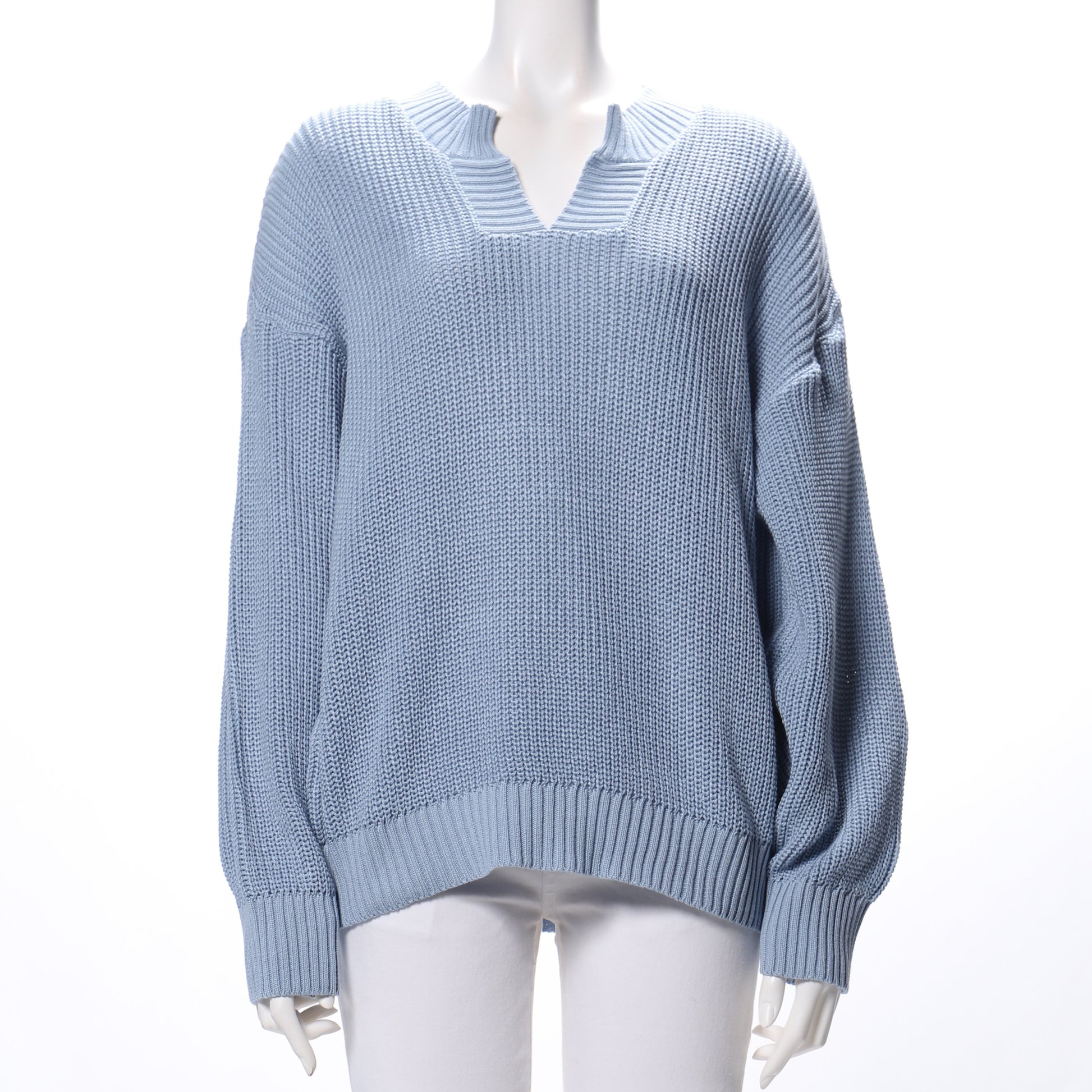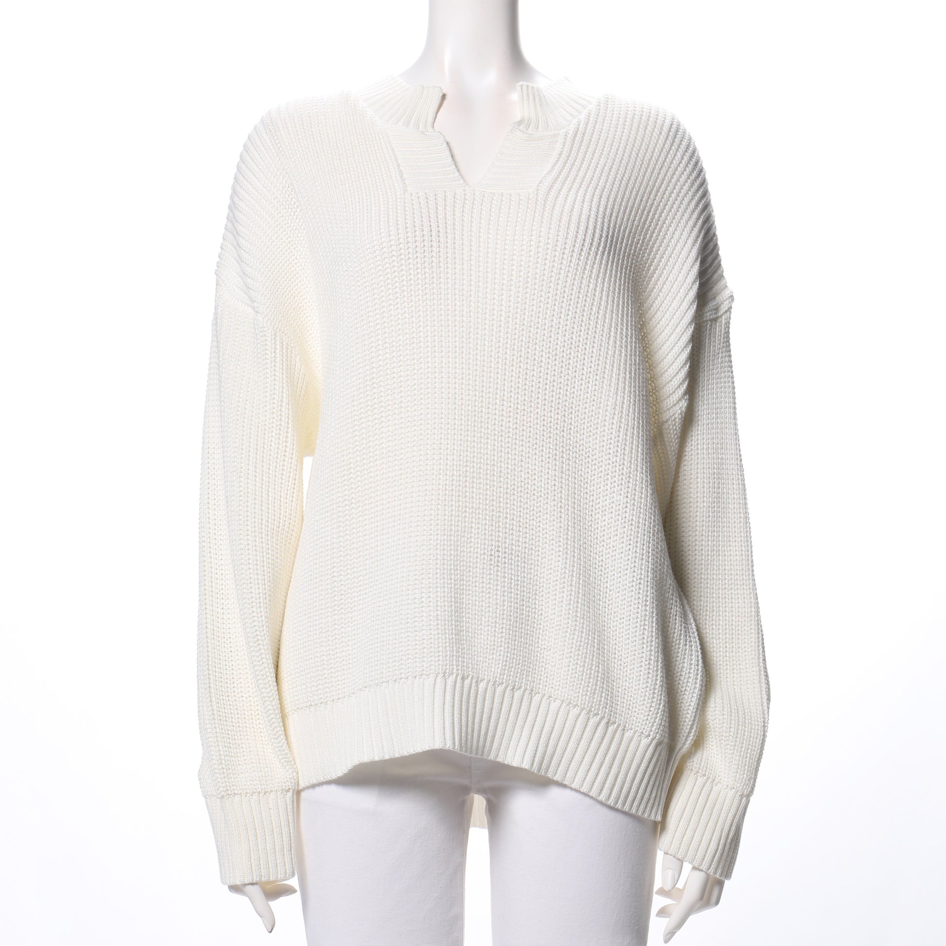 ドロップショルダーのオープンフロントネックニット。ボトムスにはテーパードパンツを合わせてキレイめカジュアルに、デニムパンツでラフにまとめてもいいですね。