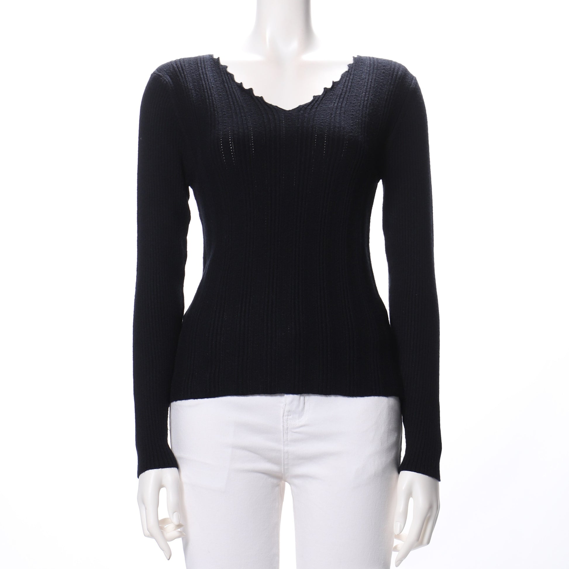ネックラインのギザギザカットがポイントのリブニット。フレアスカートとヒールパンプスを合わせてきれいめカジュアルに着こなしたり、デニムパンツとスニーカーを合わせてラフに着こなすのもおすすめですよ。