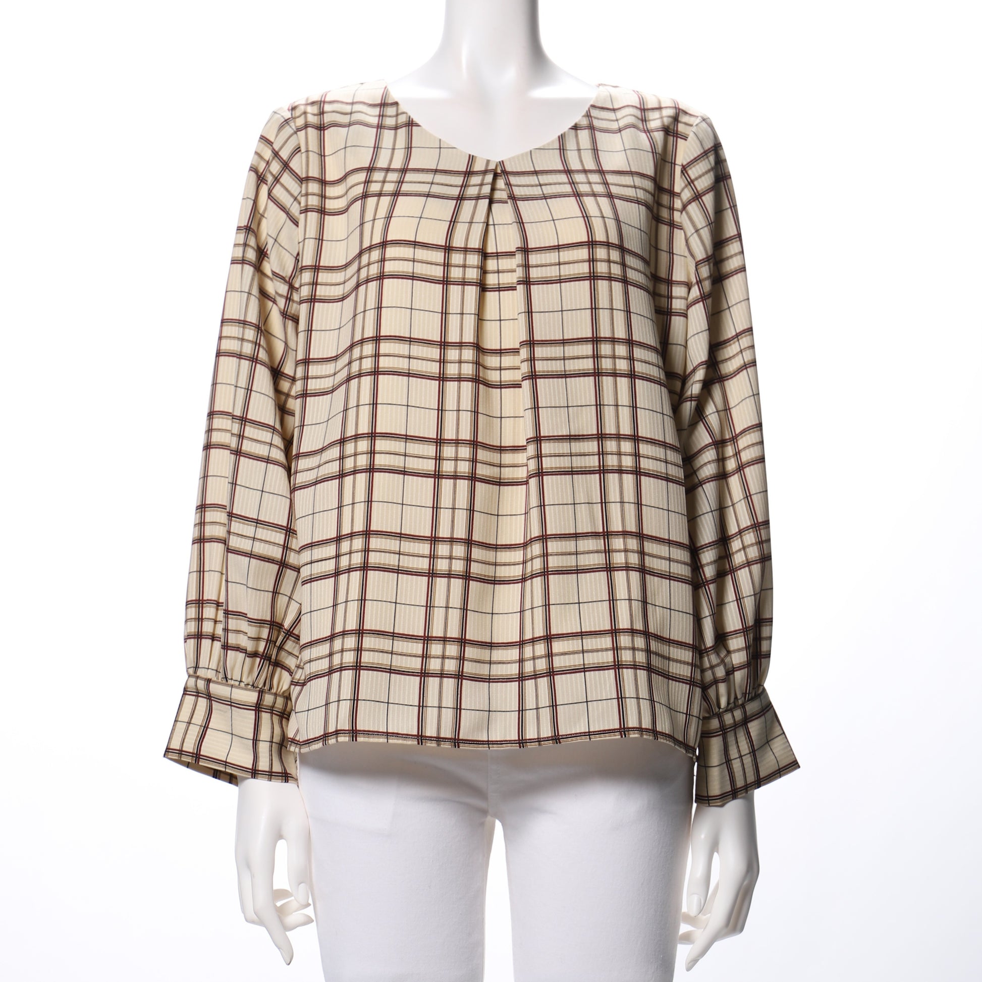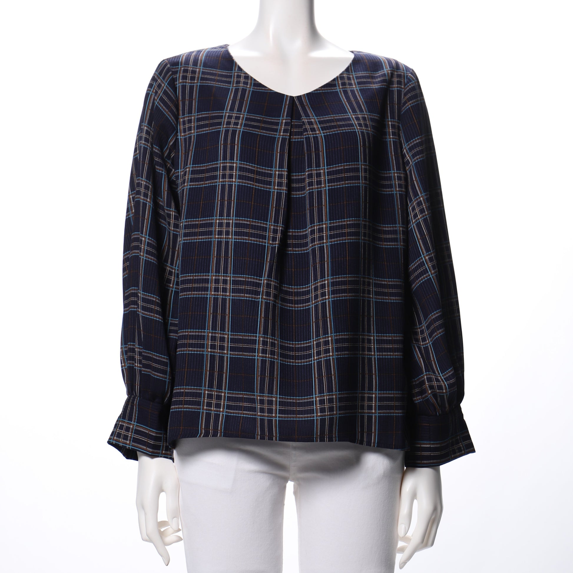 チェック柄のタックネックブラウス。フレアスカートを合わせてきれいめに、デニムパンツを合わせてカジュアルに着てもいいですね。
