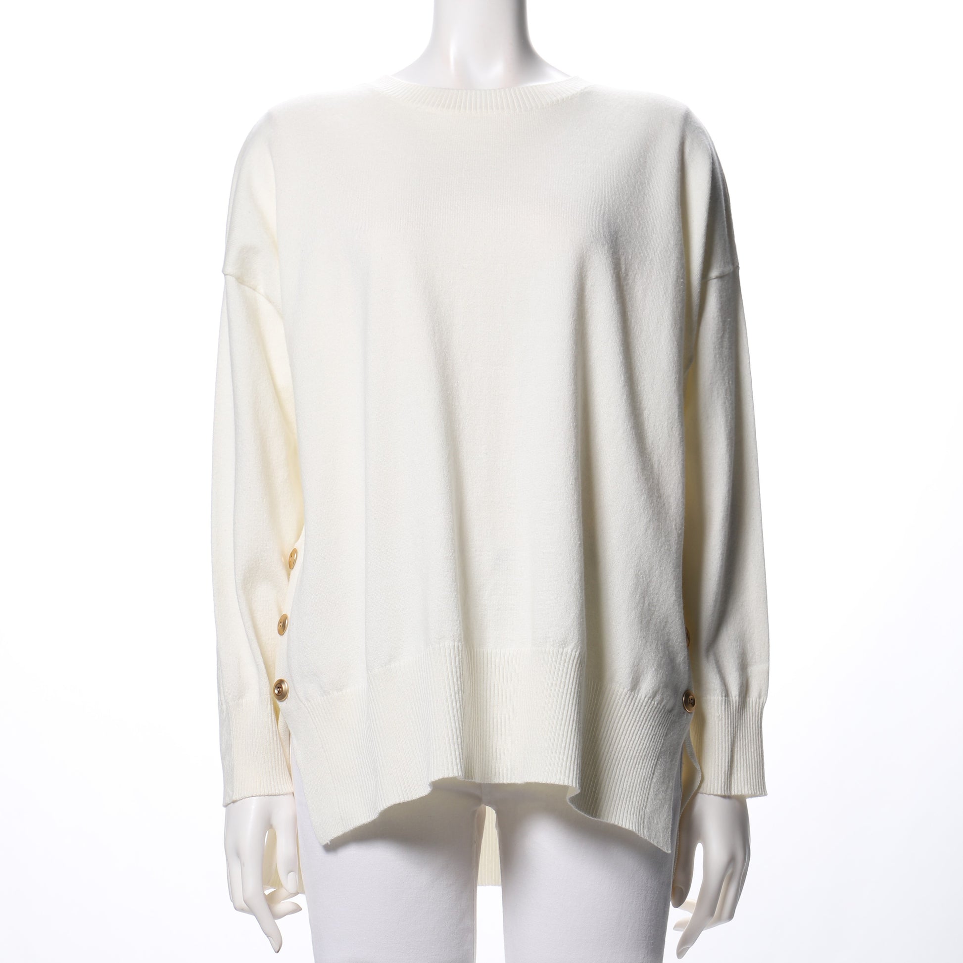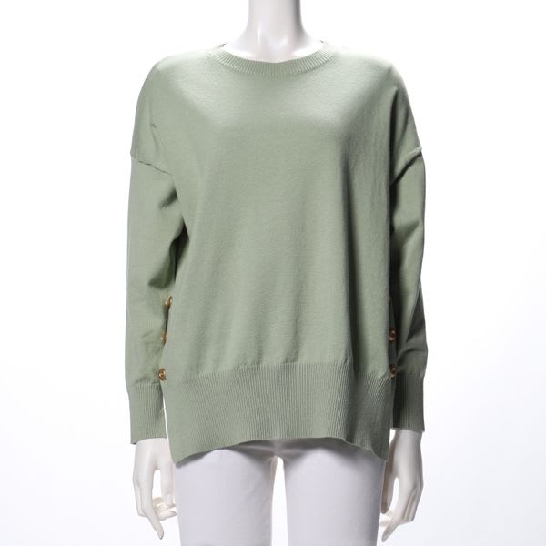 サイドのゴールドボタンがアクセントのクルーネックニット。ボタンは開けてスリットの深さを調整して着用できますよ。ボトムスにはデニムパンツを合わせてカジュアルに、プリーツスカートで女性らしく仕上げてもいいですね。