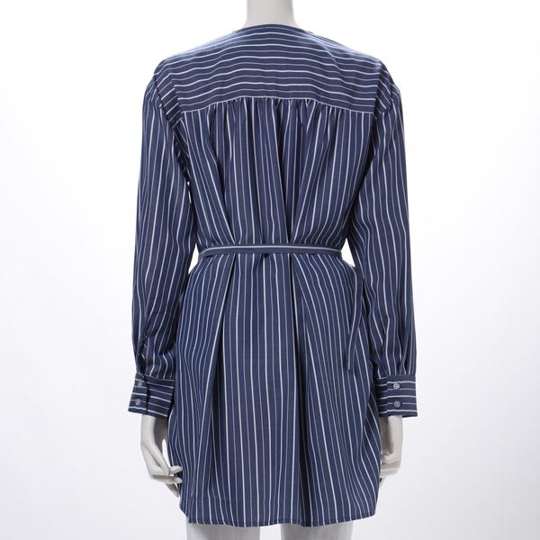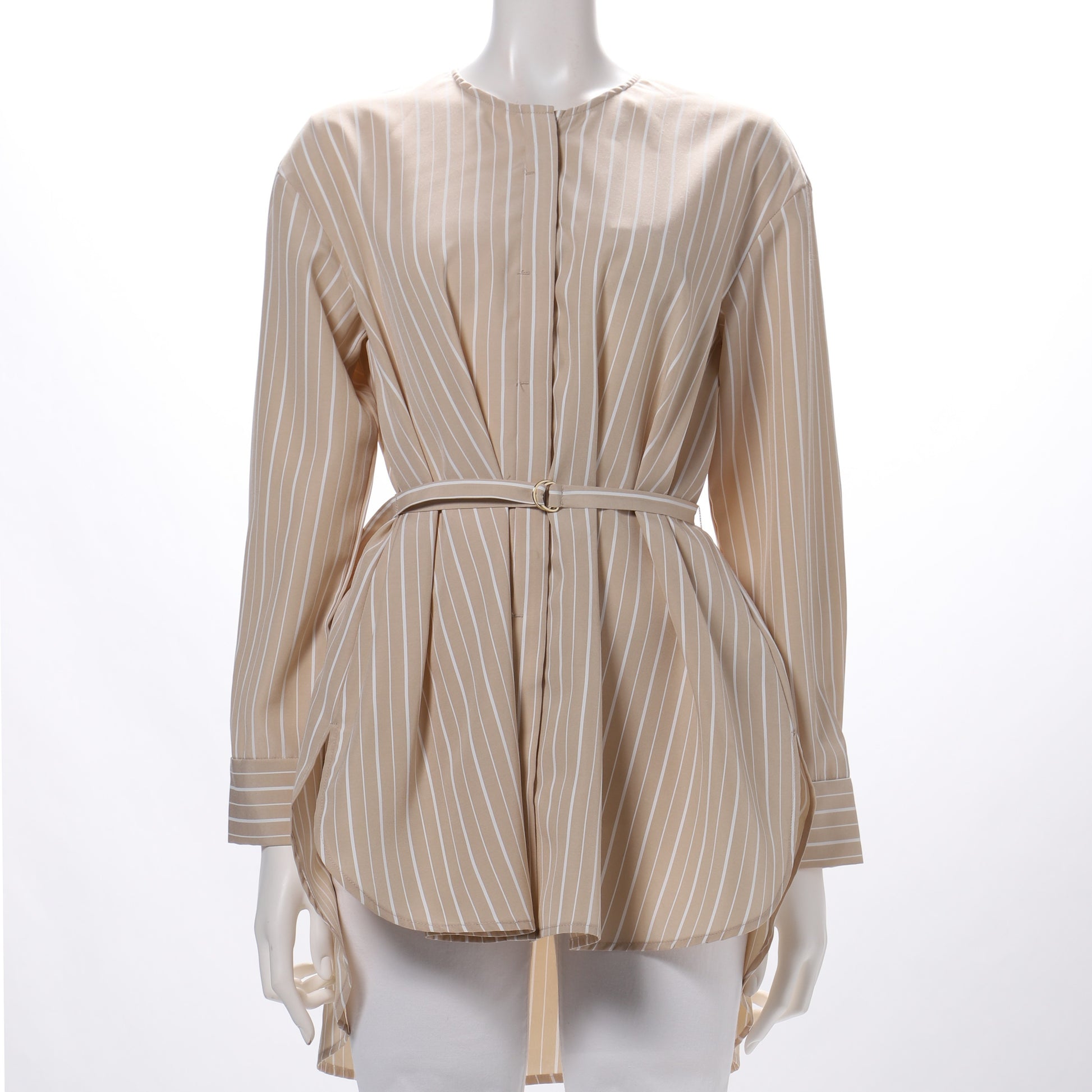 裾の前後差がポイントのベルト付きストライプ柄ブラウスです。タイトスカートを合わせてレディライクな着こなしに、デニムパンツを合わせてラフな着こなしも素敵ですよ。(前開きデザインです。)