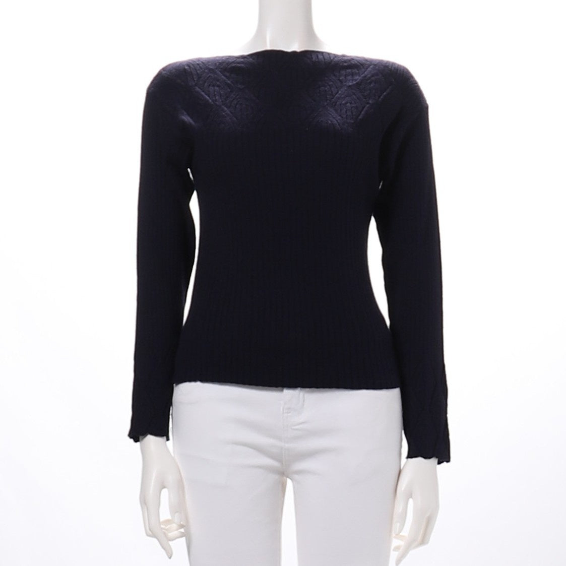 首周りや袖口に編みデザインのあるスラッシュドネックリブニット。センタープレスのパンツを合わせてクールなスタイルに、フレアスカートを合わせてエレガントなスタイルも素敵です。