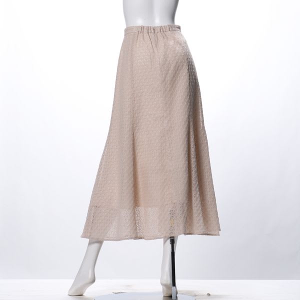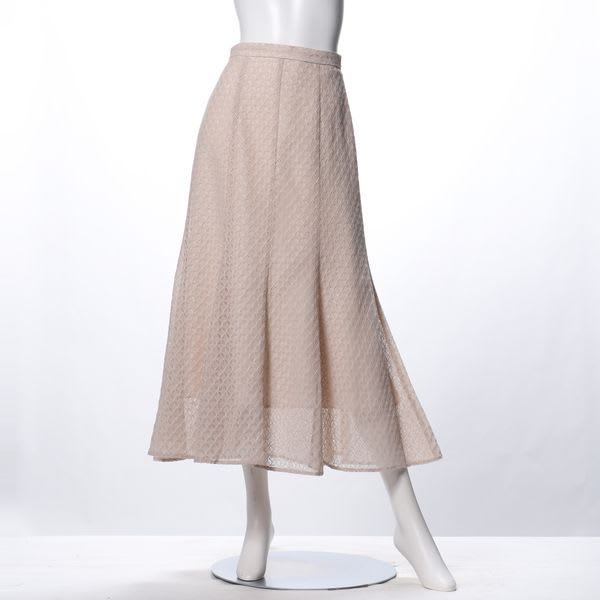 「◎な所・着心地が良い!マーメイドラインだけれどタイト過ぎずな所が良い。足さばきも楽。且つスタイル良く見える・幾何レースがカジュアルな感じが出て良い。レース素材だけどフェミニン過ぎない所が好き○な所・タックのおかげでお腹周りがすっきり・優しい桜色」