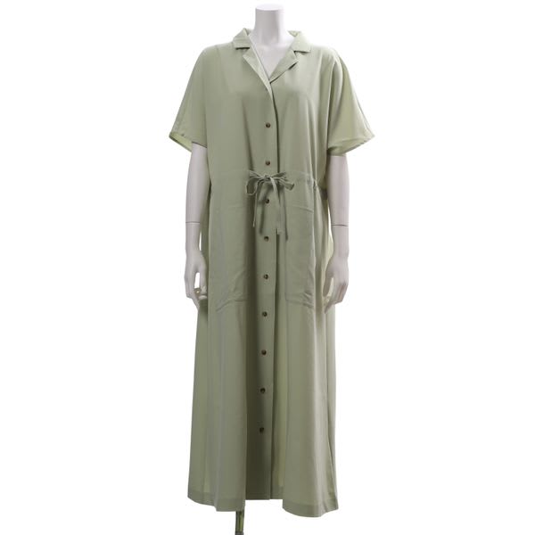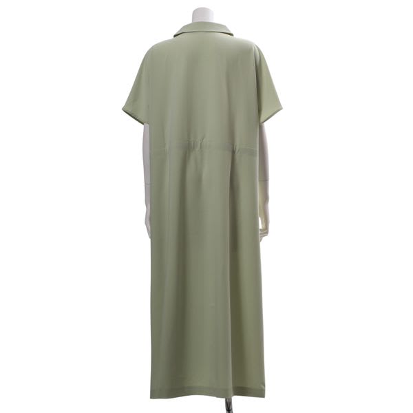 前開きのオープンカラーワンピース。ウエストのドロストリボンは軽く絞ってお召し下さいね。パンプスとレザーバッグを合わせてきれいめに、スニーカーと天然素材のバッグでカジュアルに着こなしても素敵です。