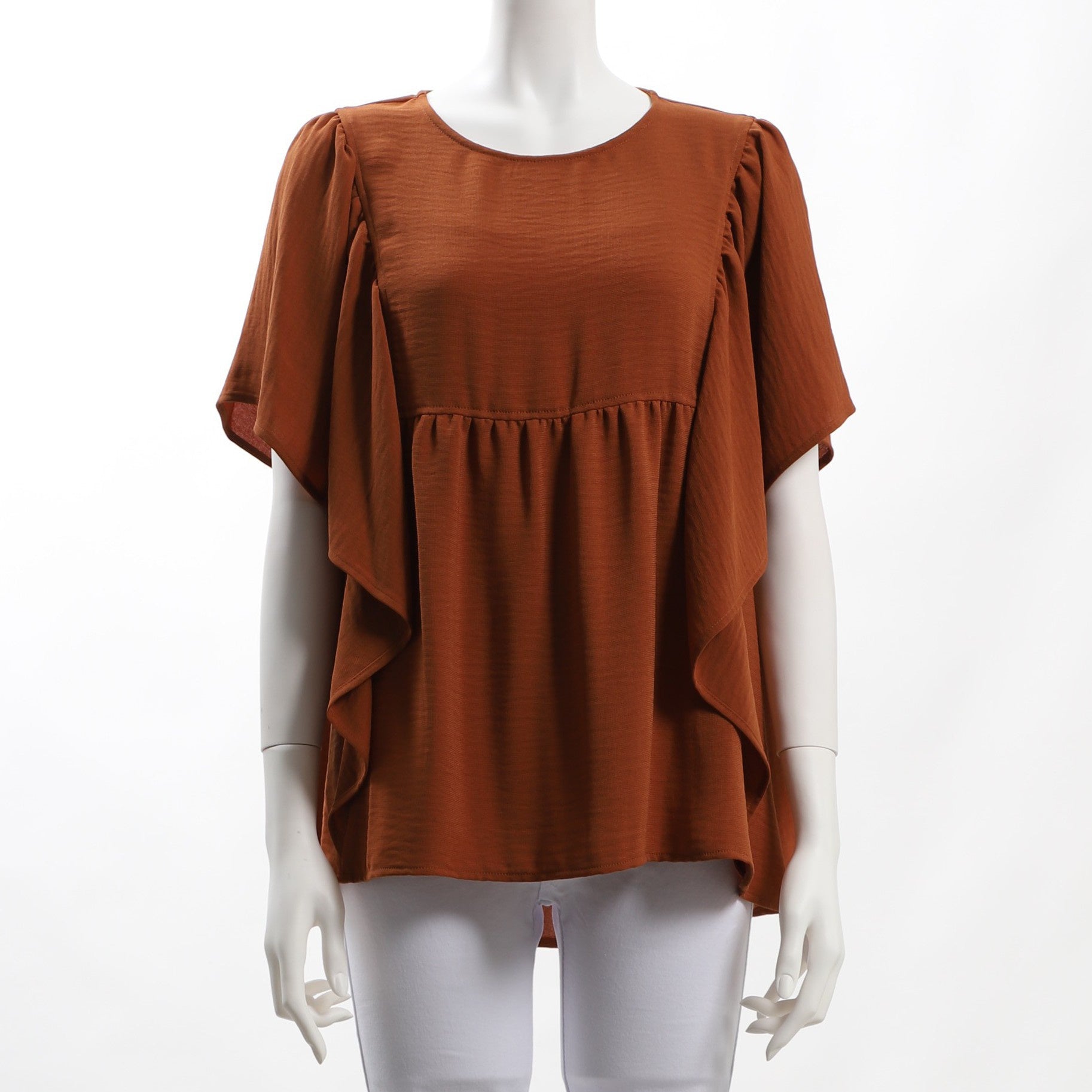 胸下の切り替えやフレアスリーブがポイントのラウンドネックブラウスです。タイトスカートとパンプスを合わせてレディライクなスタイルや、ワイドパンツとフラットシューズを合わせてカジュアルなスタイルもいいですね。