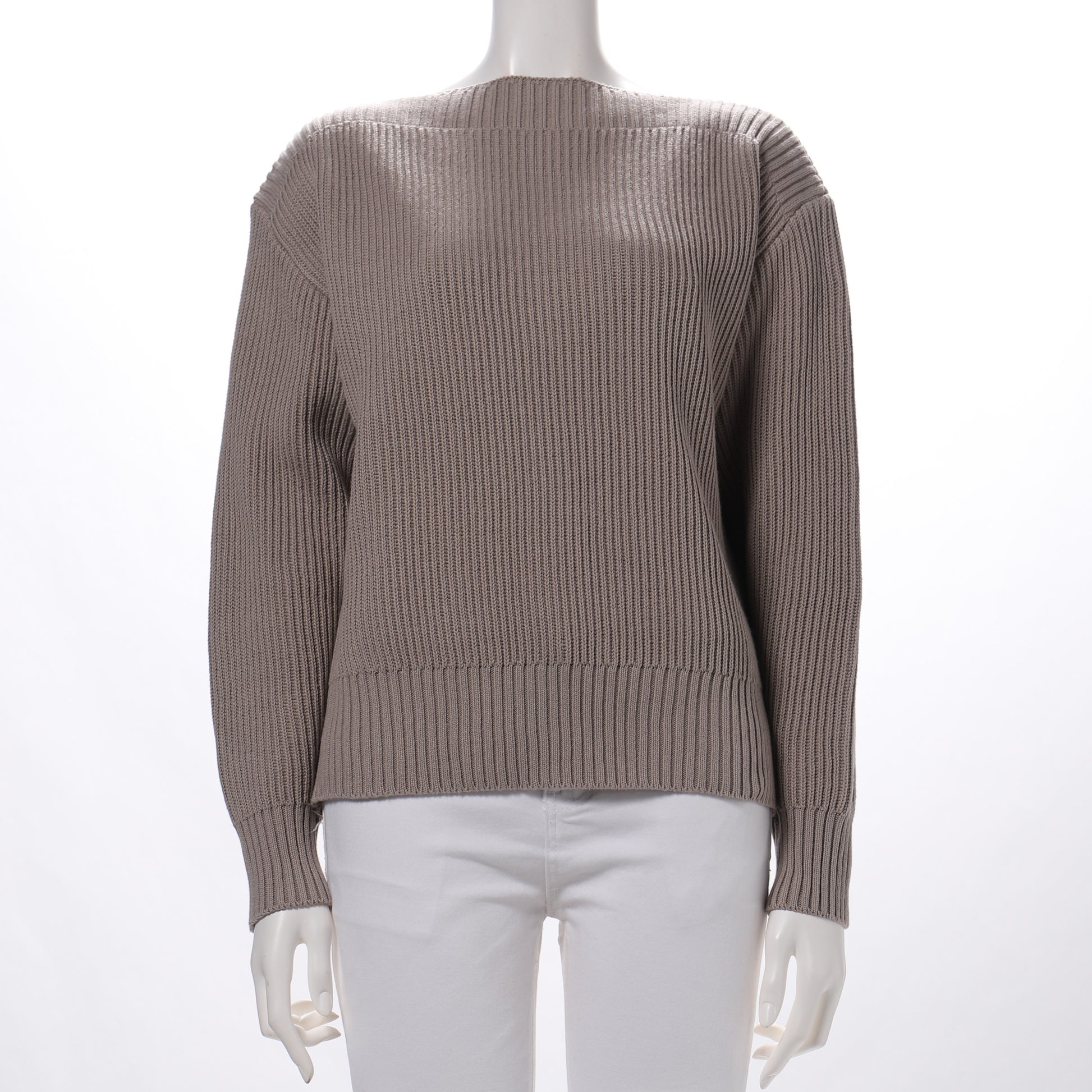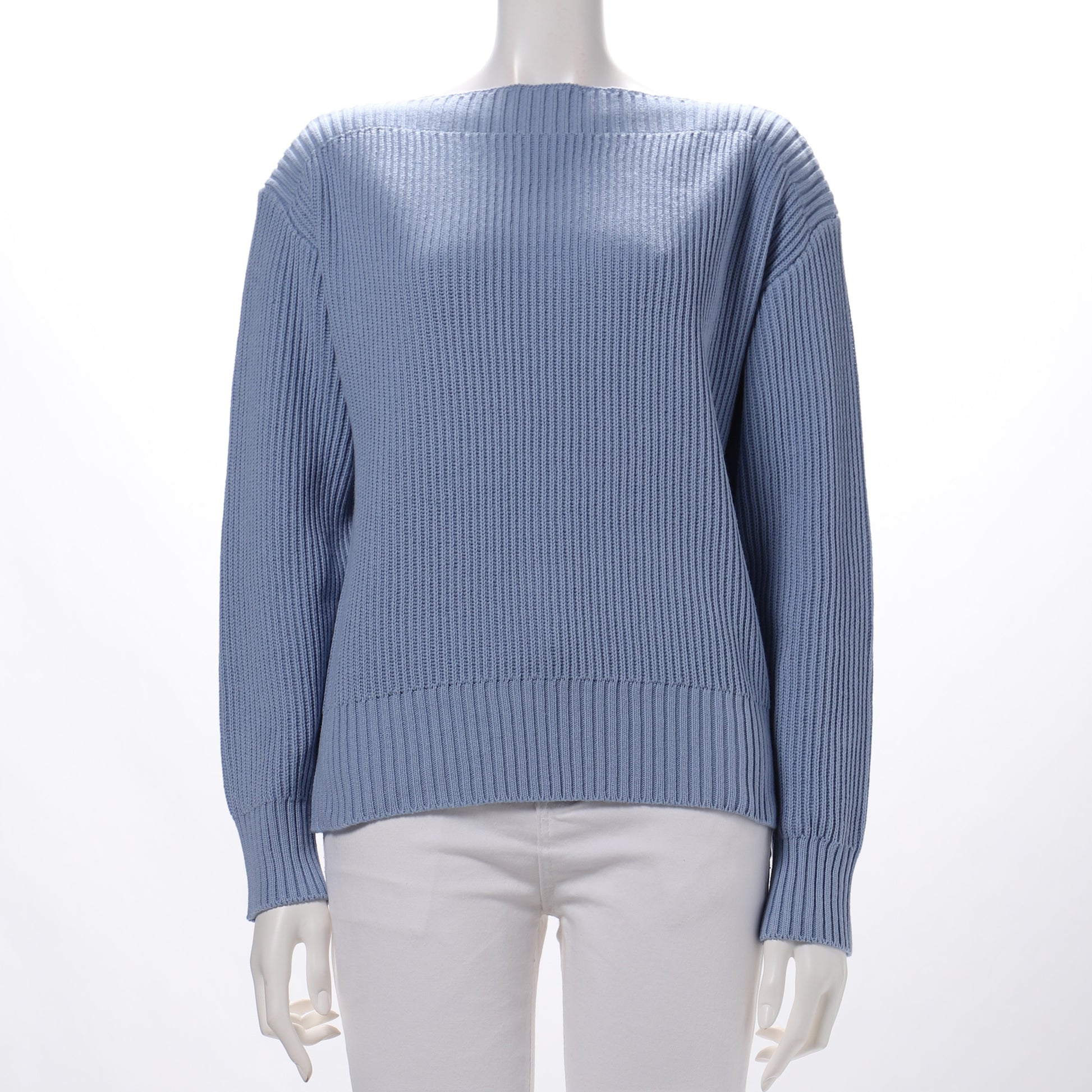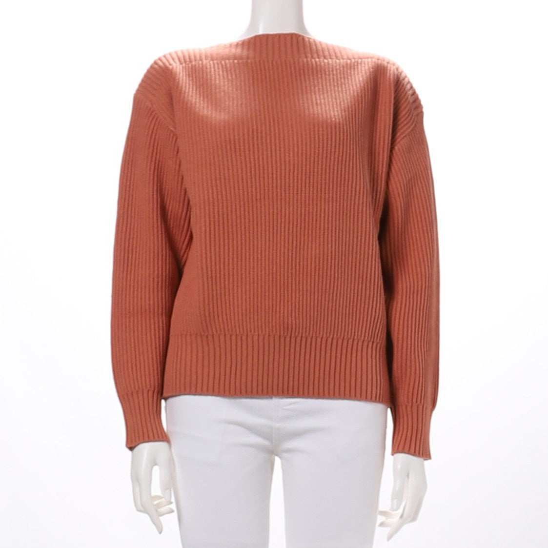 スラッシュドネックのドロップショルダーニット。ロングスカートとバレエシューズを合わせて女性らしいスタイルに、デニムパンツとスニーカーを合わせてラフな着こなしもおすすめですよ!