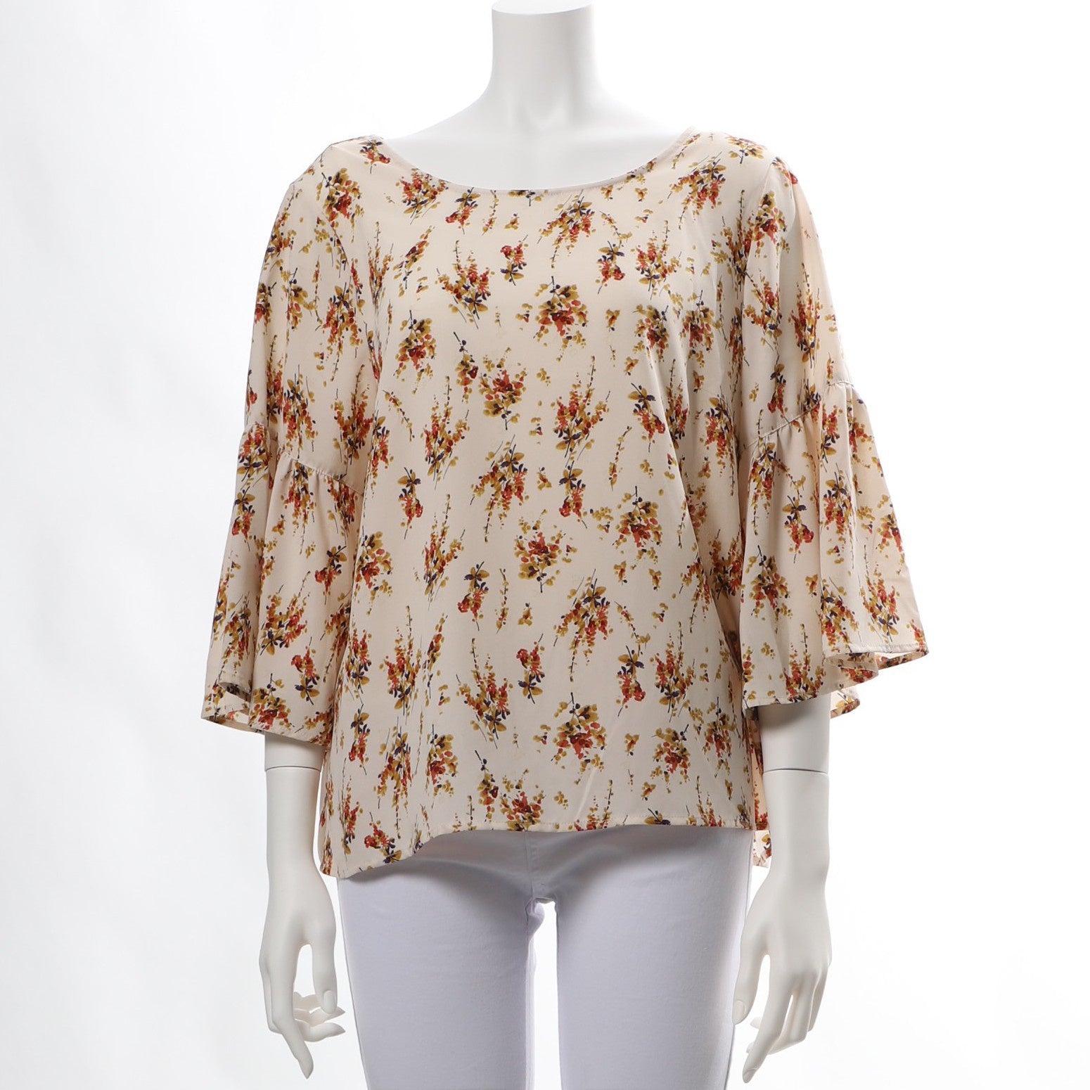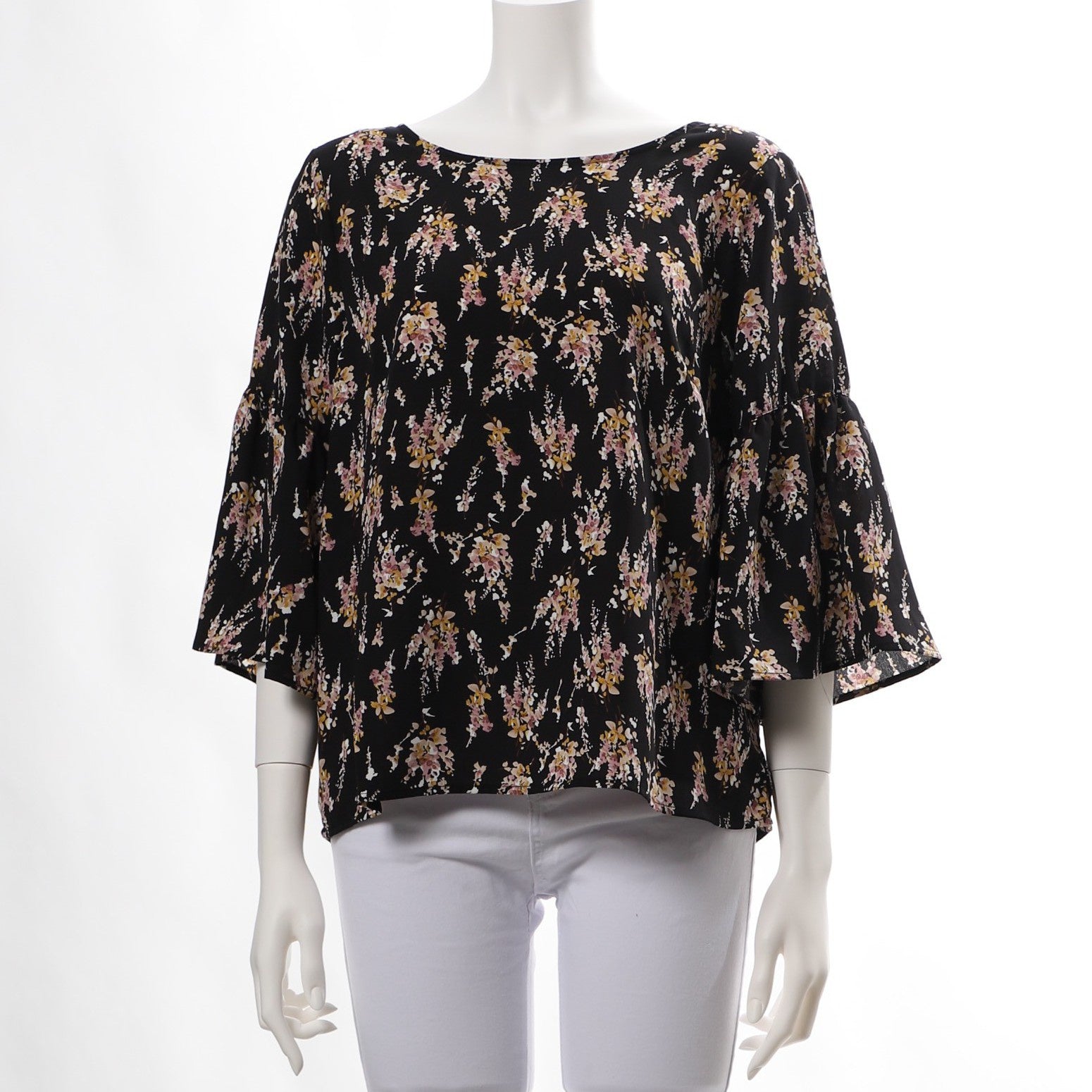 お袖のデザインやバックボタンがポイントの花柄ブラウス。ボトムスにはペンシルスカートを合わせて女性らしく、デニムパンツでカジュアルにまとめてもいいですね。