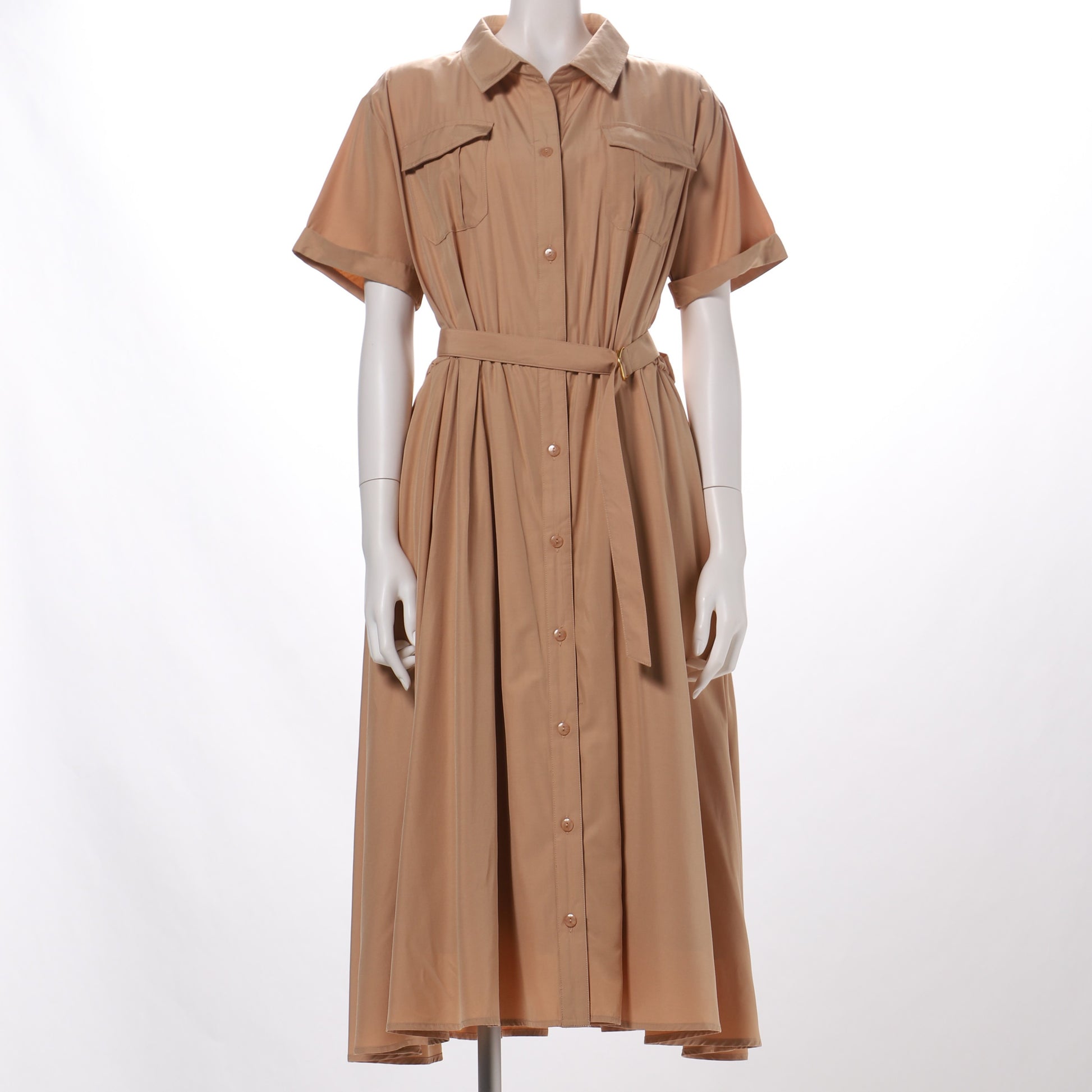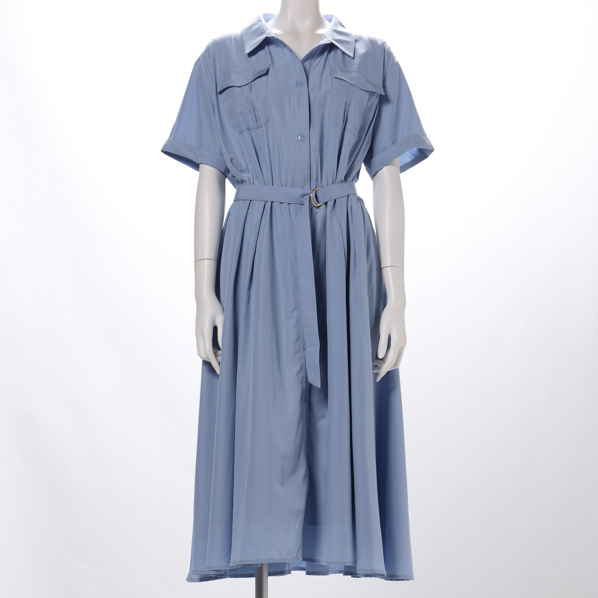 胸元のポケットデザインがポイントのシャツカラーワンピース。ベルトは一度後ろに回してから前に持ってきて留めてくださいね。フラットシューズを合わせてラフな着こなしに、ヒールパンプスを合わせてレディライクな着こなしも◎です。