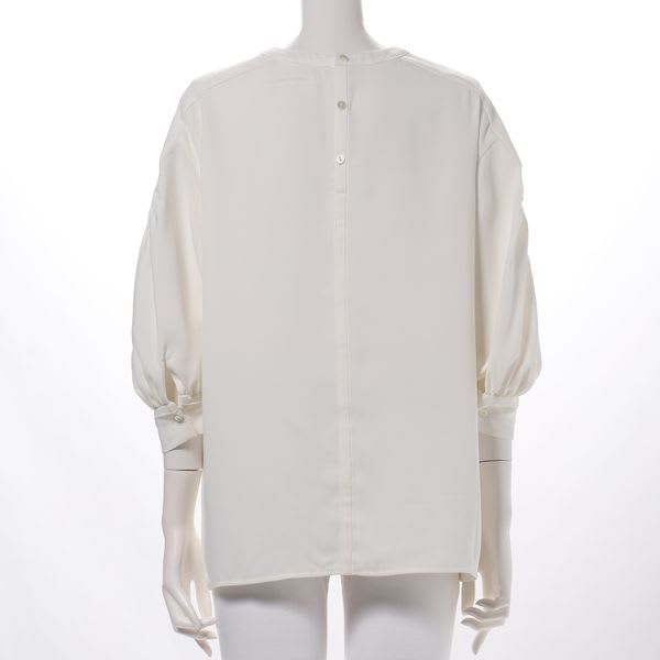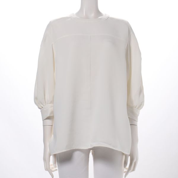 フロントの切り替えは身体のラインを細く締まった印象に見せ、ドロップしたショルダーと腕のギャザーにより腕を綺麗に見せつつも気になる部分をデザインによりカバーしています。