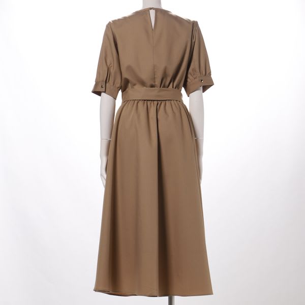 ゴールドのDカンベルト付きのワンピース。ハンドバッグとラウンドパンプスを合わせて女性らしいスタイルに、キャンバストートバッグとスニーカーを合わせてカジュアルスタイルもおすすめです!