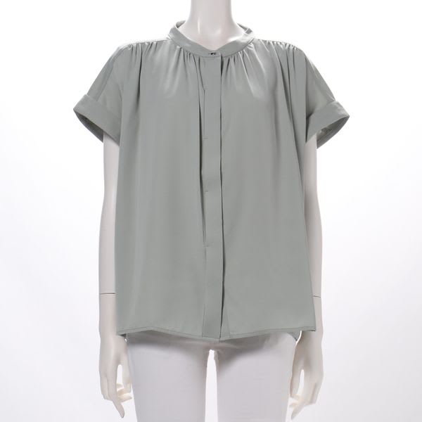 トップのシルバー釦がアクセントになった前開きブラウスです。タイトスカートを合わせて、女性らしい着こなしに。デニムパンツを合わせて、カジュアルなコーディネートもいいですね。