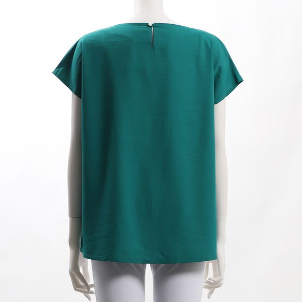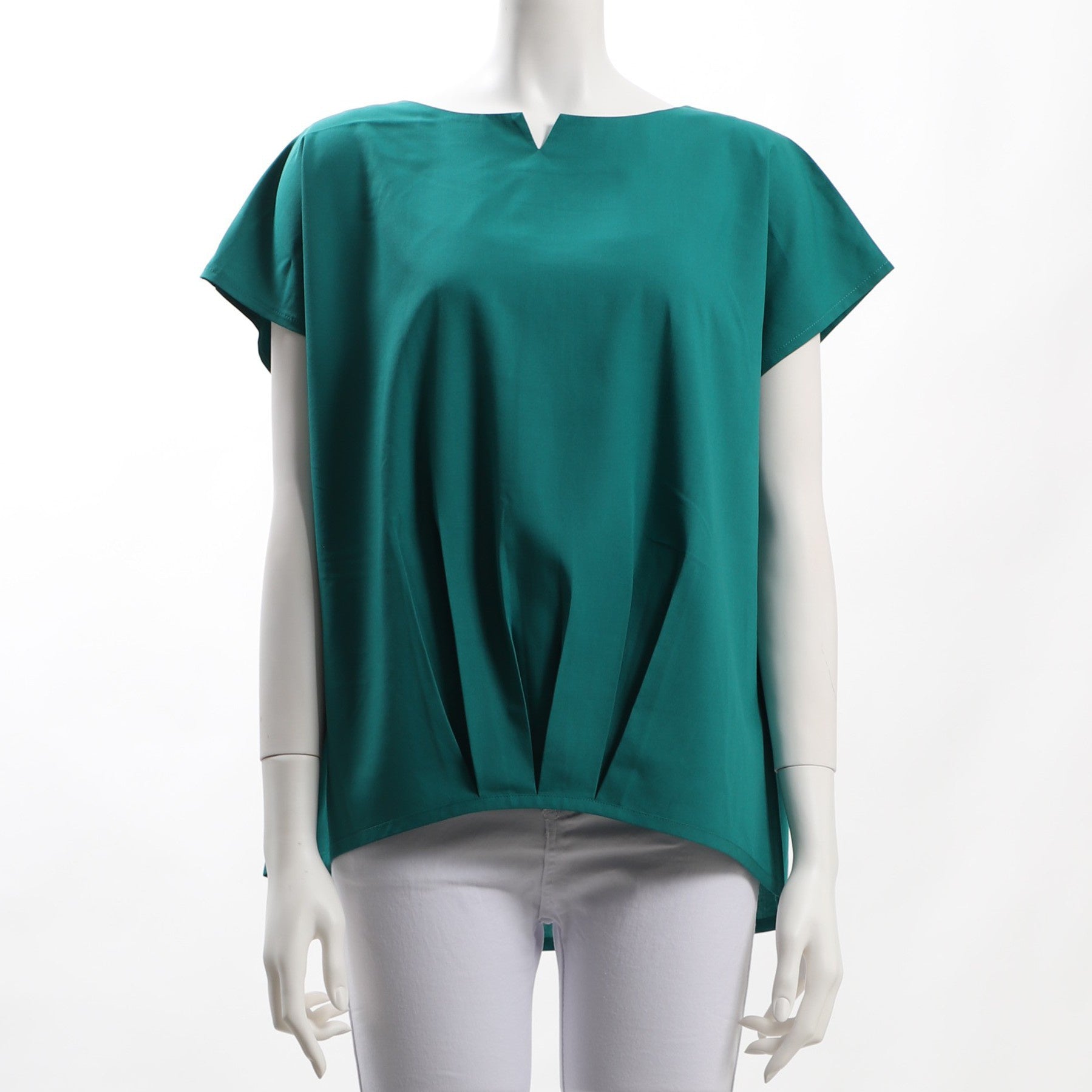 「丈感もバッチリで色もオシャレで最高でした!裾のタックのおかげで、だらしなく見えなく、素材も涼しくて、シワになりにくくよかったです。フレンチスリーブは好きだが、病気をした影響で二の腕に傷があるので、少し長めのフレンチスリーブか、このブラウスよりもう少し長めの袖がありがたいです。」