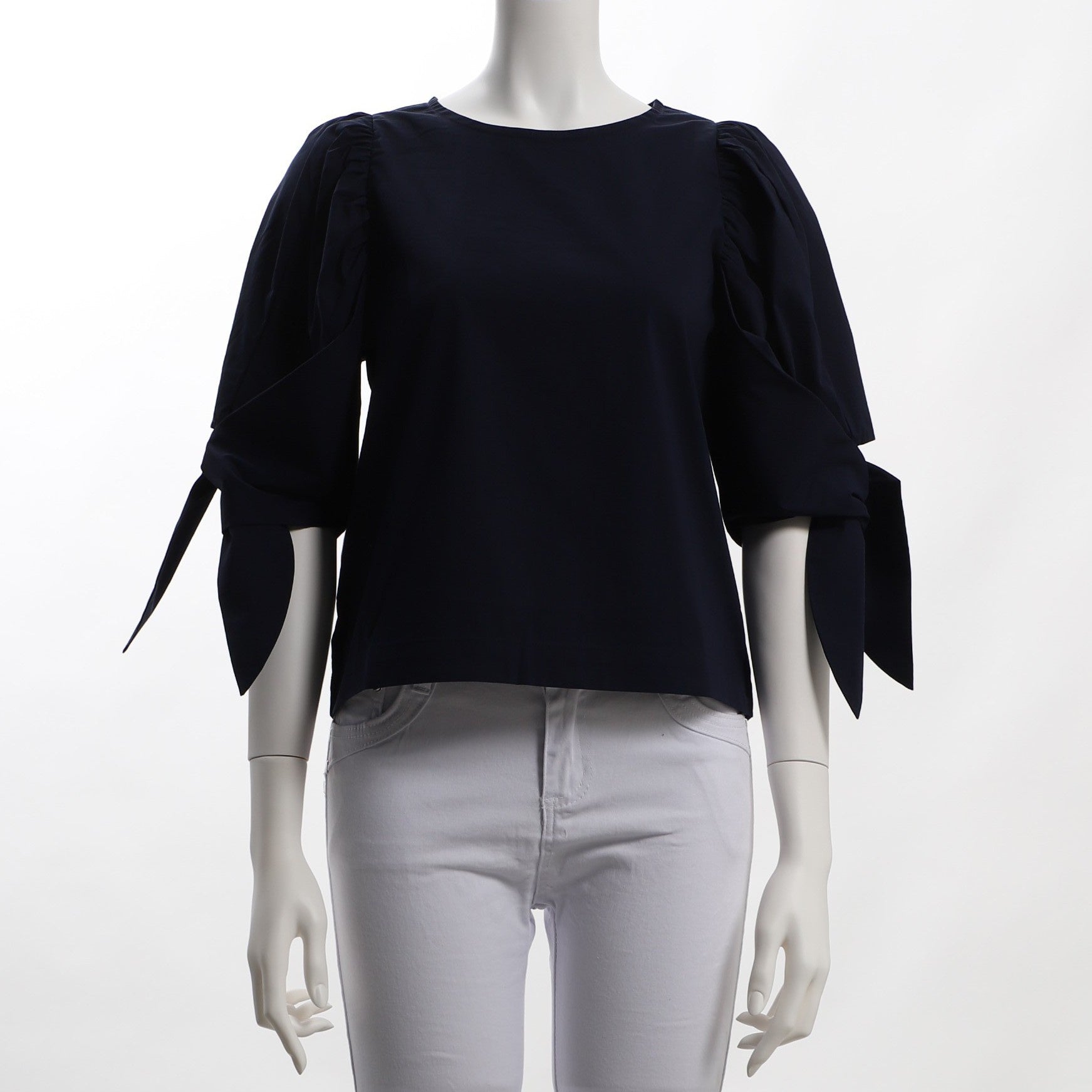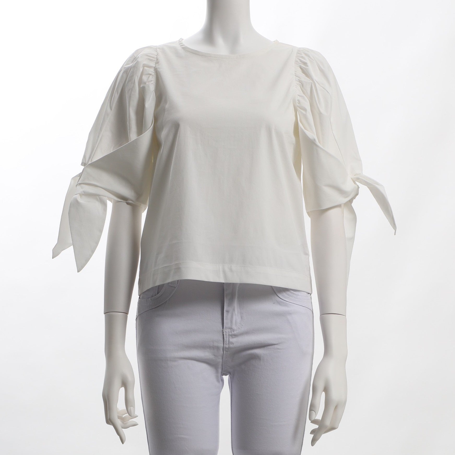 袖口のリボンがアクセントになったブラウスです。フレアスカートを合わせて、フェミニンな着こなしに。デニムパンツを合わせて、カジュアルな仕上がりも素敵ですよ。