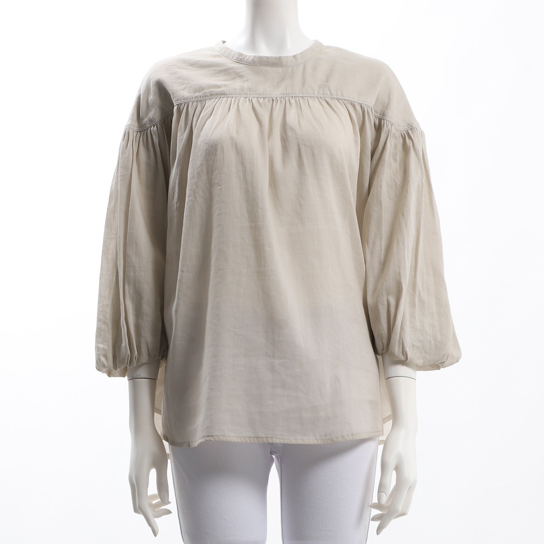 ギャザーやバックのリボンデザインがポイントのクルーネックブラウスです。デニムパンツとスニーカーを合わせてカジュアルなスタイルや、タイトスカートとパンプスを合わせてキレイめスタイルも素敵ですよ。