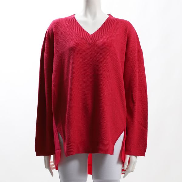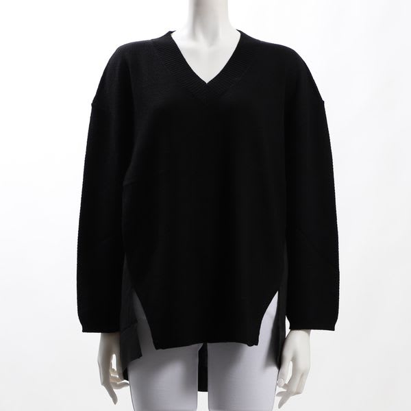 バックの異素材切り替えデザインやサイドスリットが特徴的なVネックニットです。