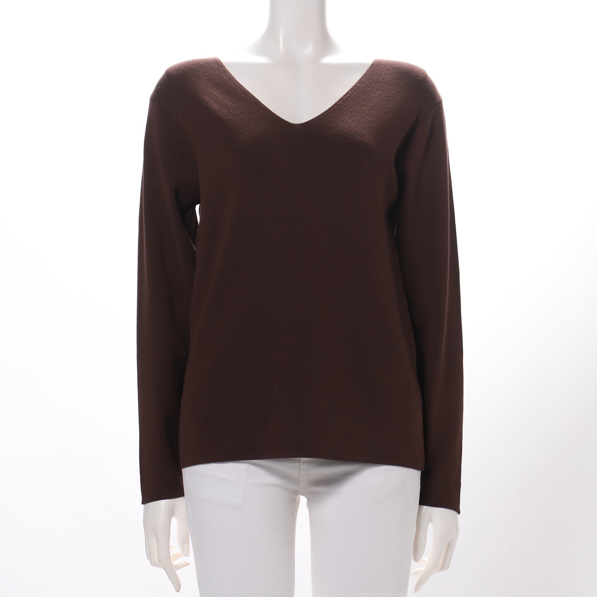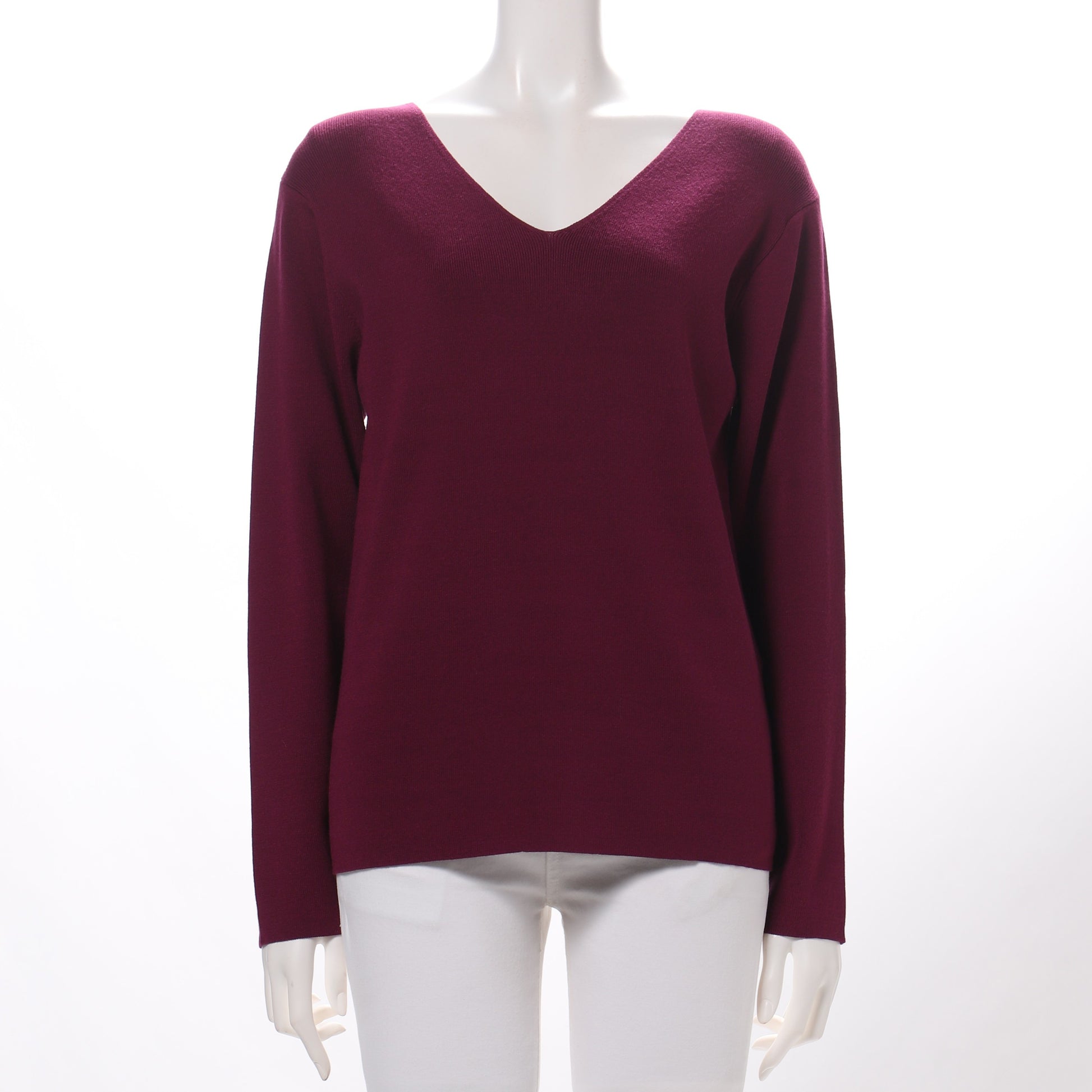 シンプルなデザインのVネックニット。フレアスカートとラウンドパンプスを合わせて女性らしいスタイルに、デニムパンツとスニーカーをわせてカジュアルスタイルもおすすめです!