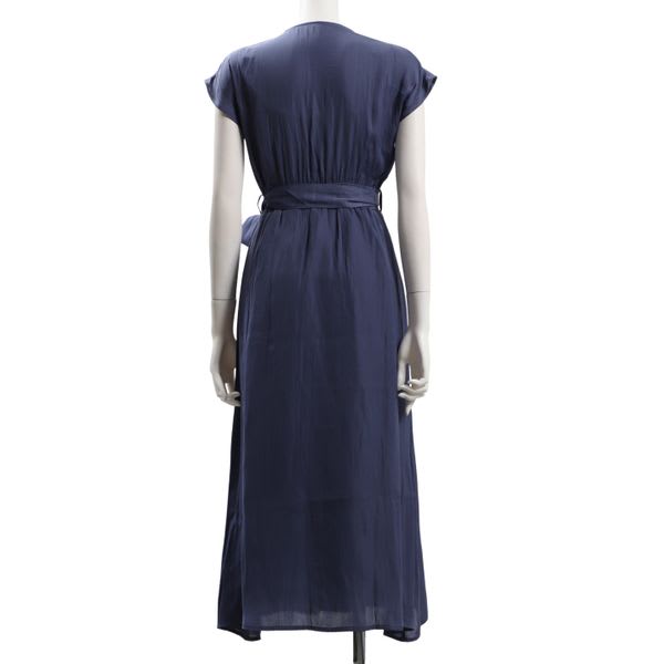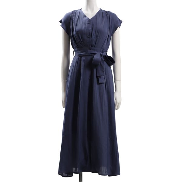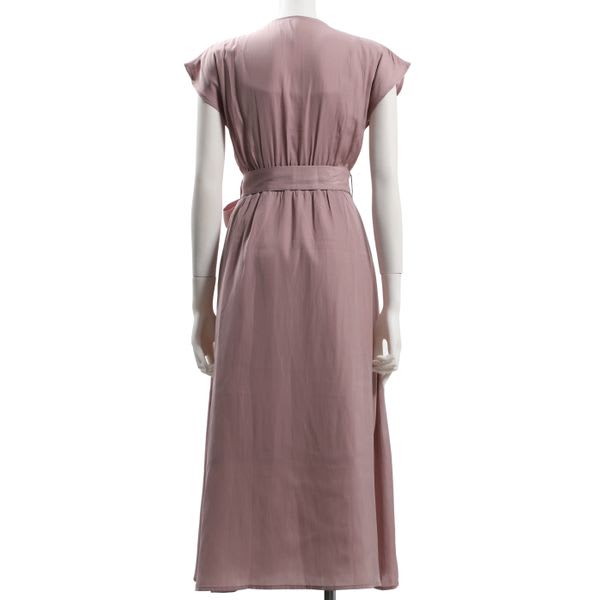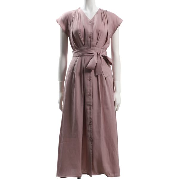 前開きデザインのVネックワンピースです。レザーのハンドバッグとローヒールパンプスを合わせてキレイめな着こなしもいいですし、コットン素材のトートバッグとスニーカーでカジュアルダウンしたスタイルも素敵ですよ。