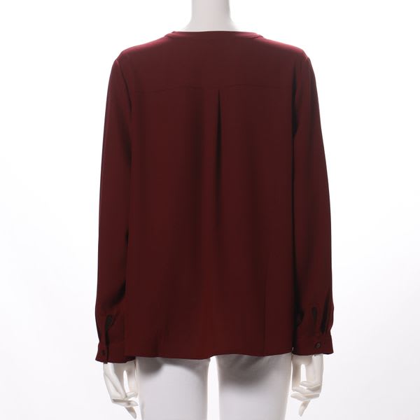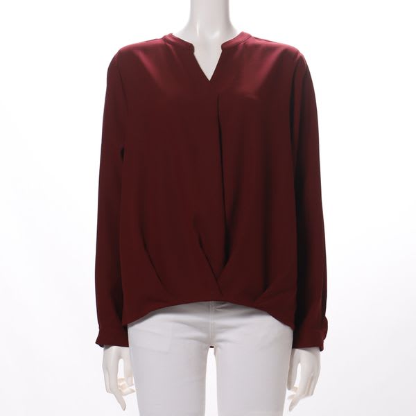 裾タックデザインのVネックブラウス。ストレートパンツに合わせてキチンと感のあるオフィススタイルに、ミモレ丈のタイトスカートを合わせてIラインコーデもスッキリ見えして良いですね!