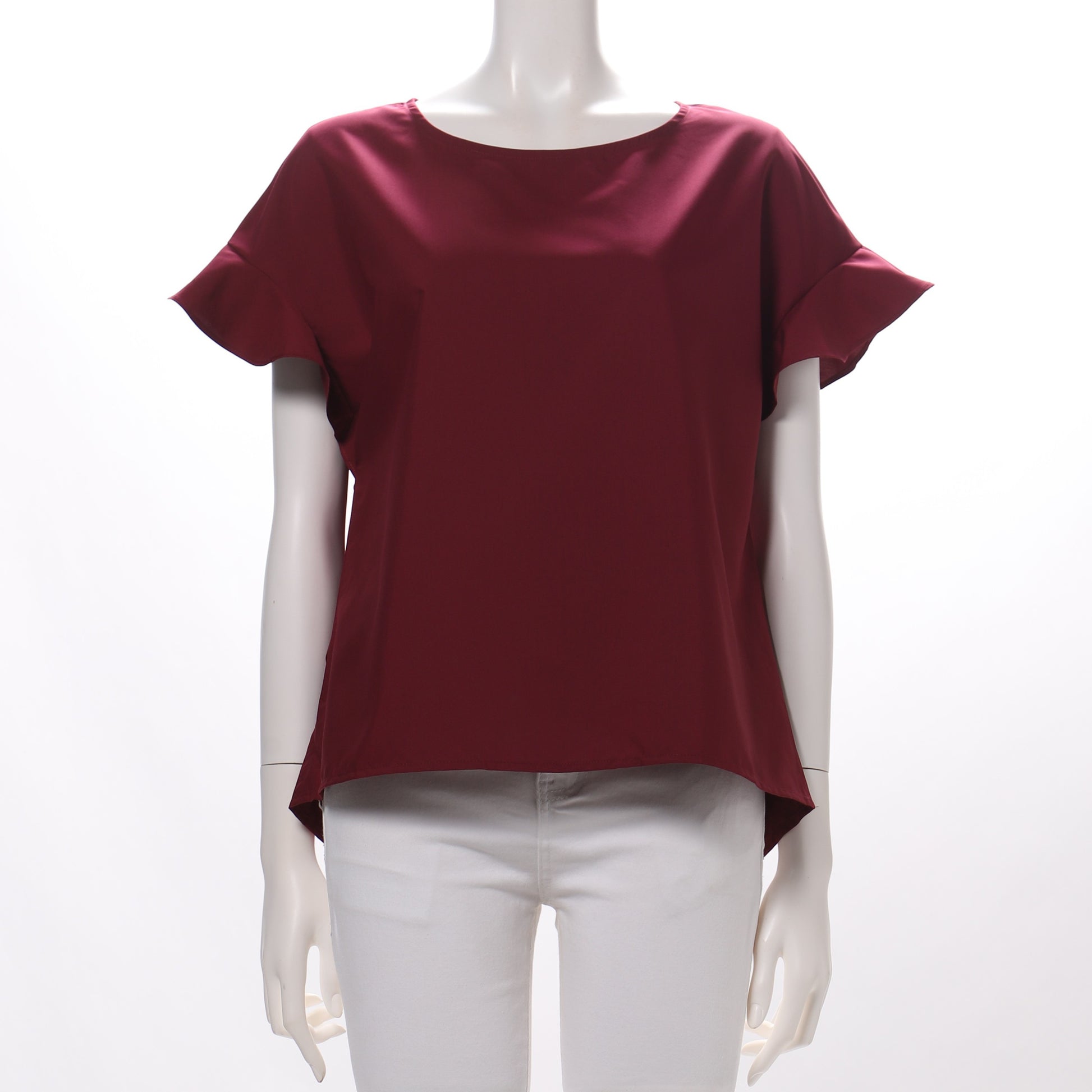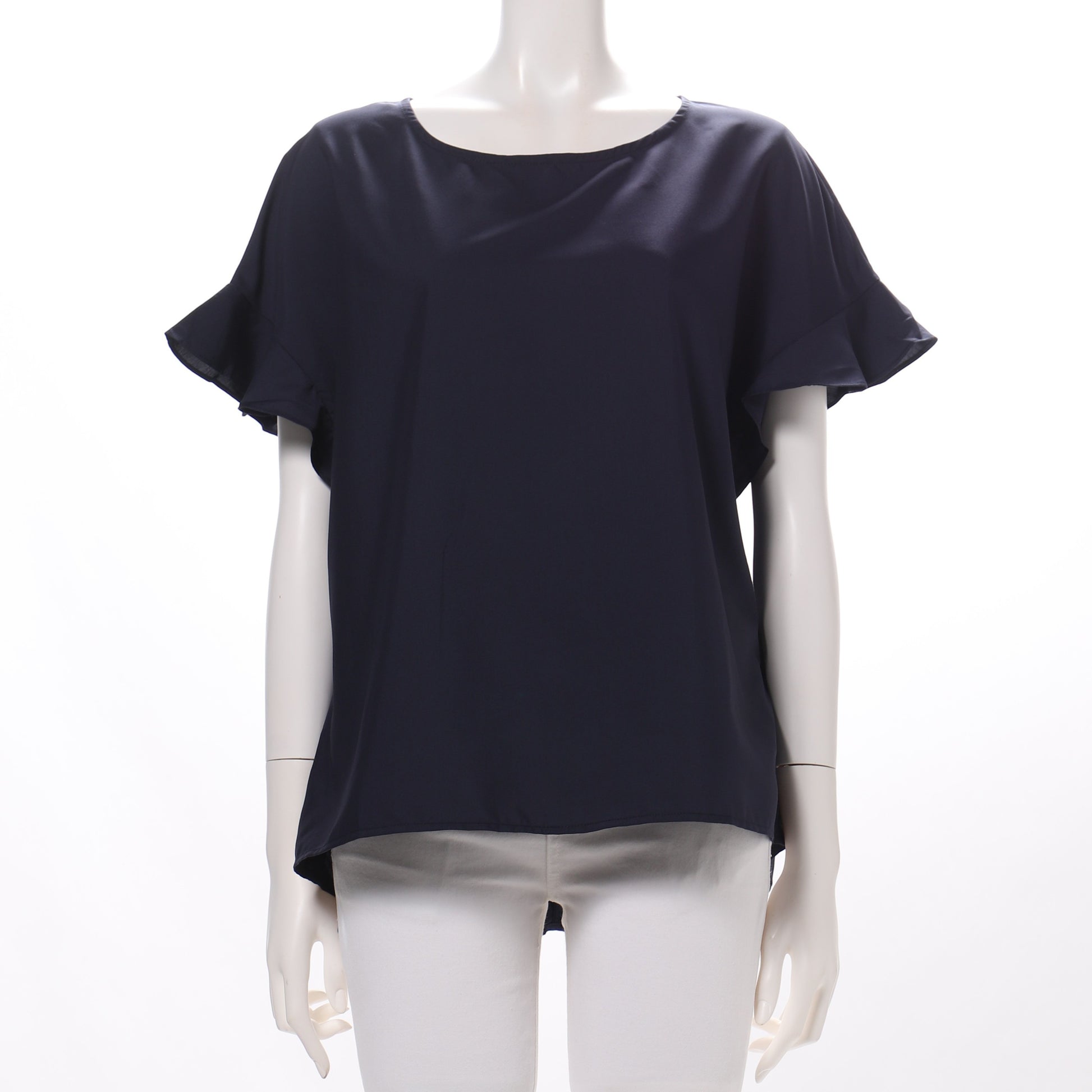 お袖のフリルデザインがポイントのラウンドネックブラウスです。タイトスカートとパンプスを合わせて女性らしいスタイルや、クロップドパンツとフラットシューズを合わせてカジュアルなスタイルもいいですね。