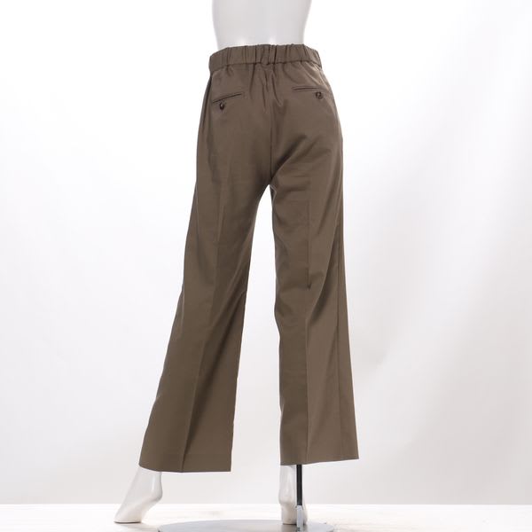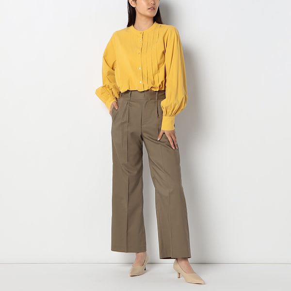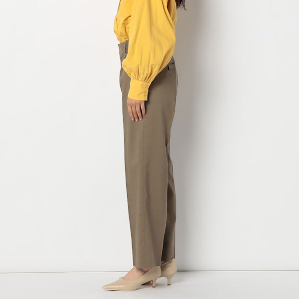 ジップアップとバックゴムで履きやすいワイドパンツ。バンドカラーブラウスを合わせてきれいめカジュアルに、リブカットソーを合わせてラフに着こなすのもおすすめですよ。