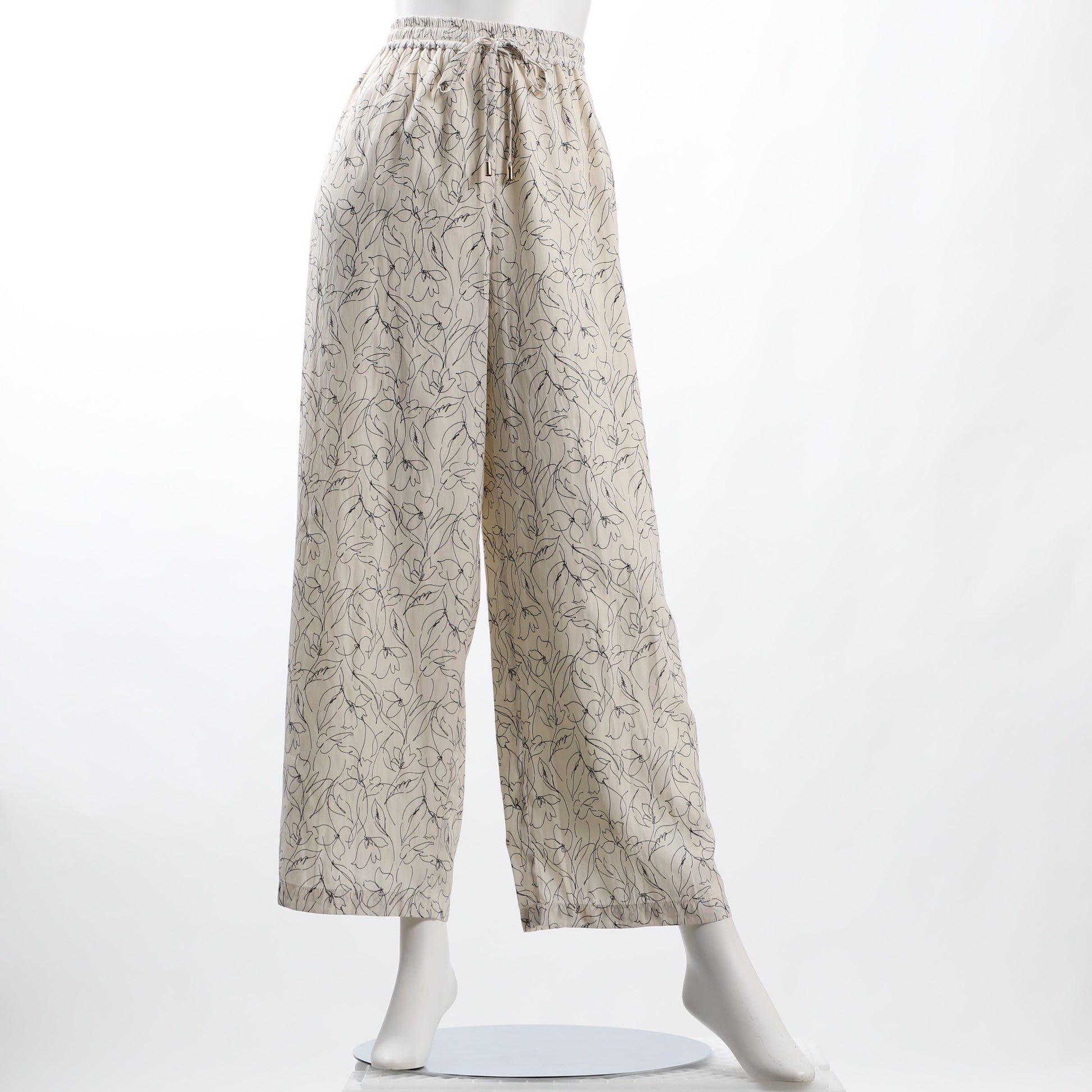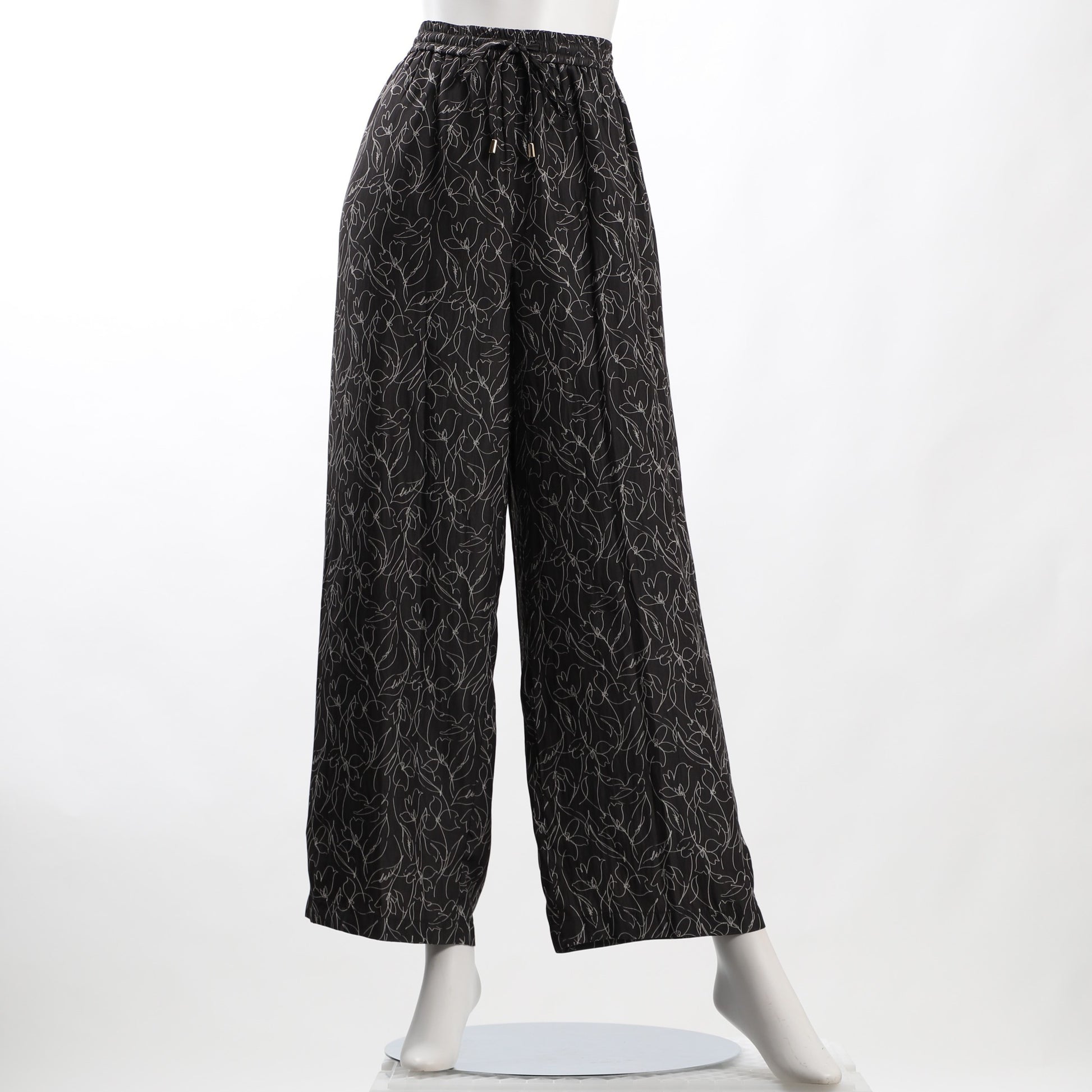 総柄ドロストワイドパンツ。トップスにはVネックのとろみブラウスを合わせてキレイめに、オーバーサイズのコットンニットでリラックス感のある着こなしもステキです。