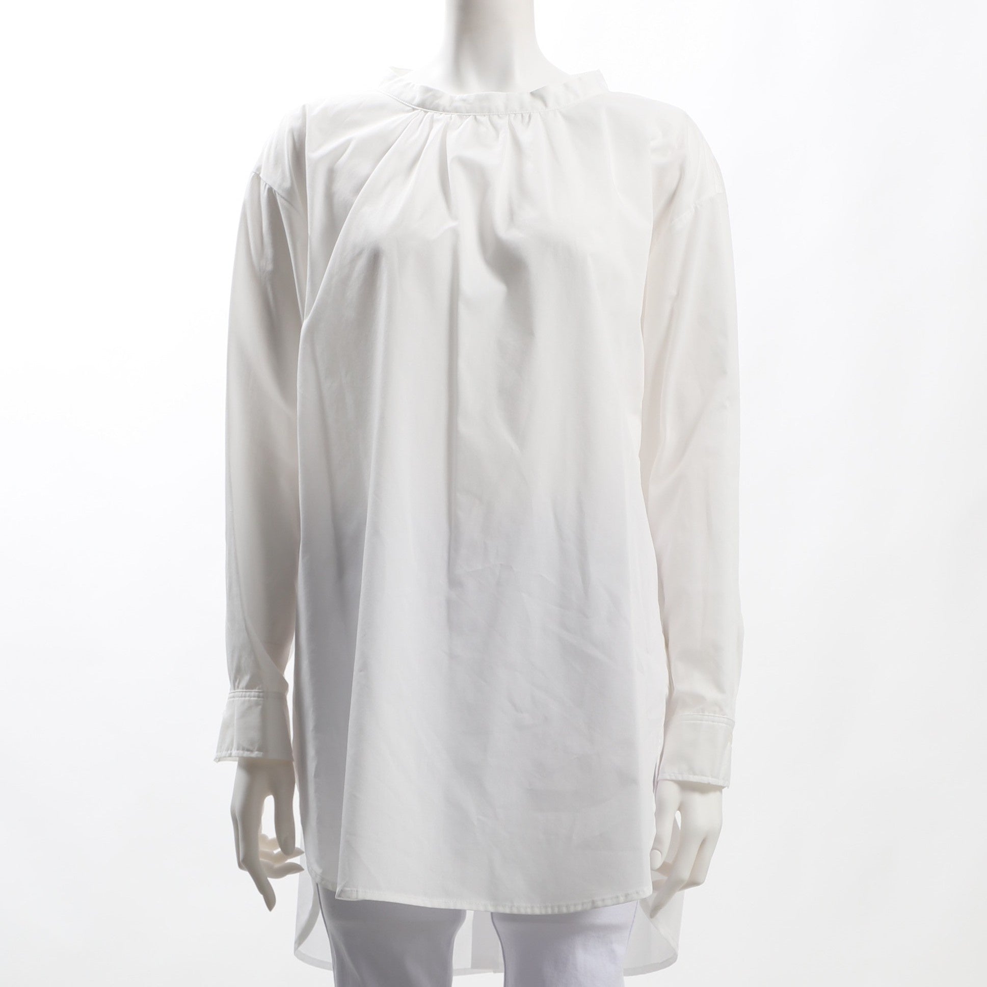 程よく詰まったネックラインやバックボタンがポイントのブラウスです。