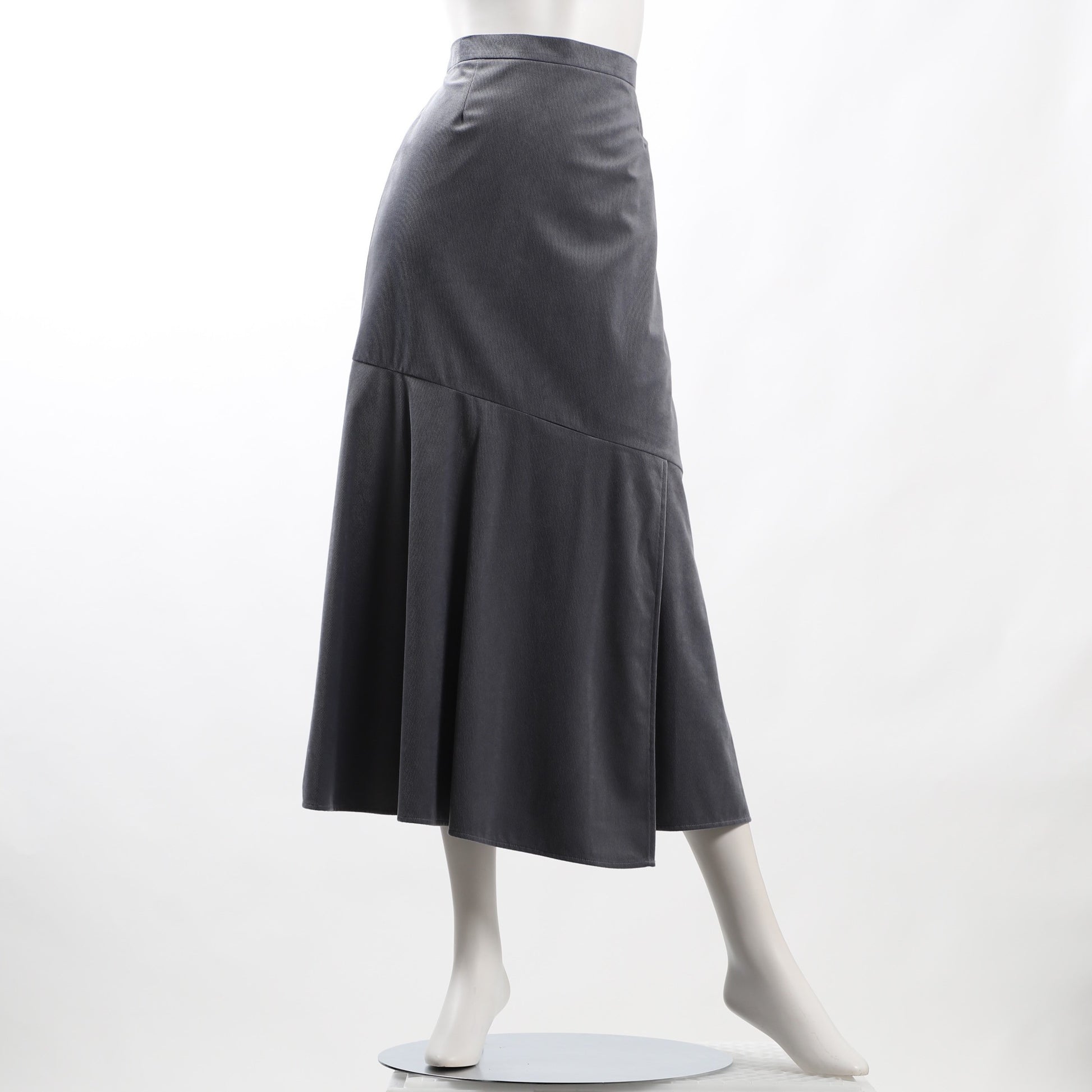 斜めの切り替えが特徴的なアシンメトリーのスカート。パフスリーブブラウスを合わせてきれいめな着こなしに、リブカットソーを合わせてカジュアルめに着るのも素敵です。